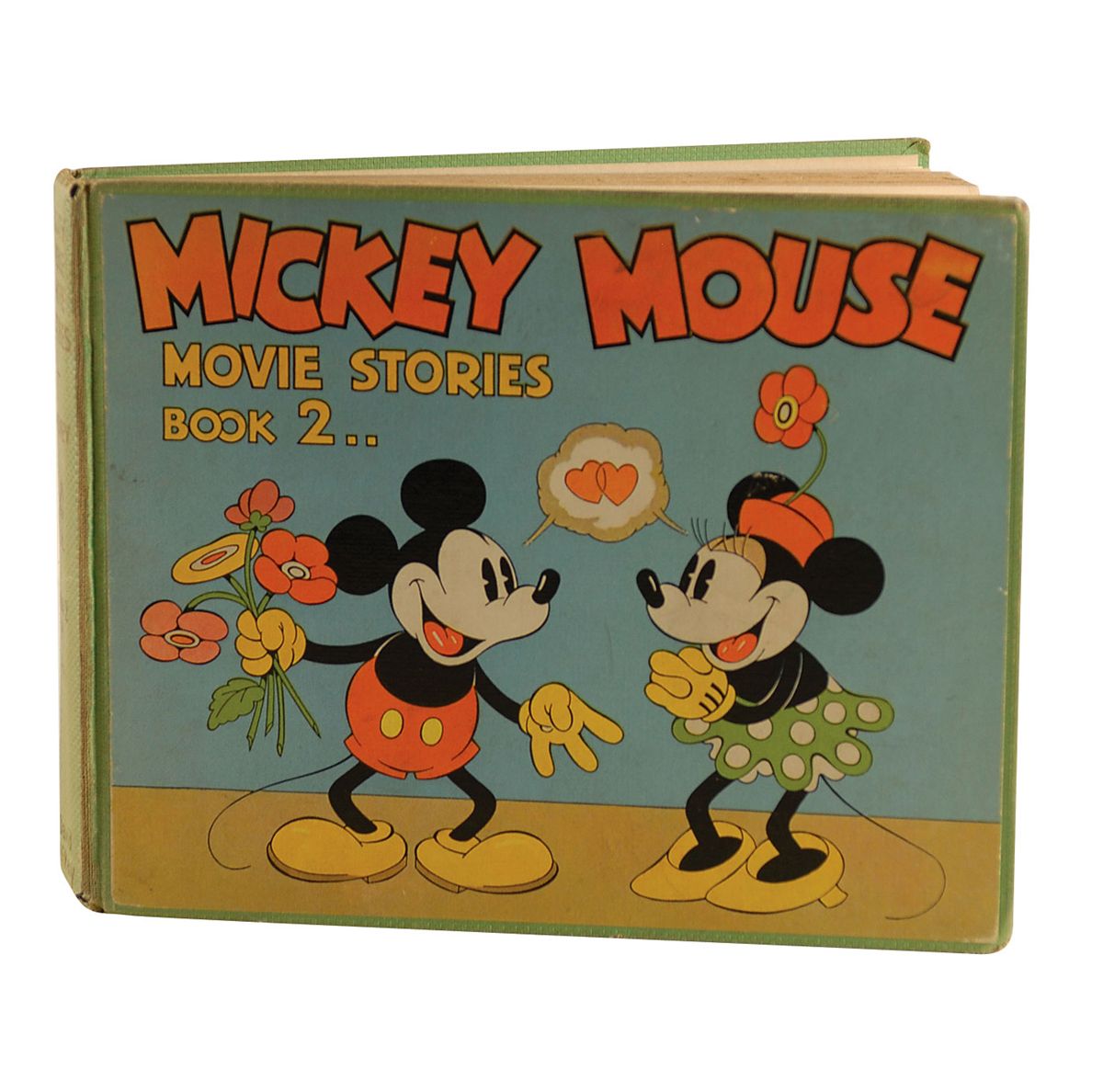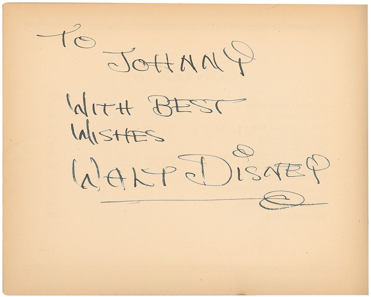 Signed book: Mickey Mouse Movie Stories, Book 2. First edition. Philadelphia: David McKay Company, 1934. Hardcover, 8.5 x 7, 196 pages. Signed and inscribed in fountain pen on the reverse of the table of contents page, “To Johnny, With best wishes, Walt Disney.” A uniform shade of light toning to all interior pages, some light wear, rubbing, and soiling to covers, and a partially separated joint to spine, along with some small separations, otherwise fine condition.