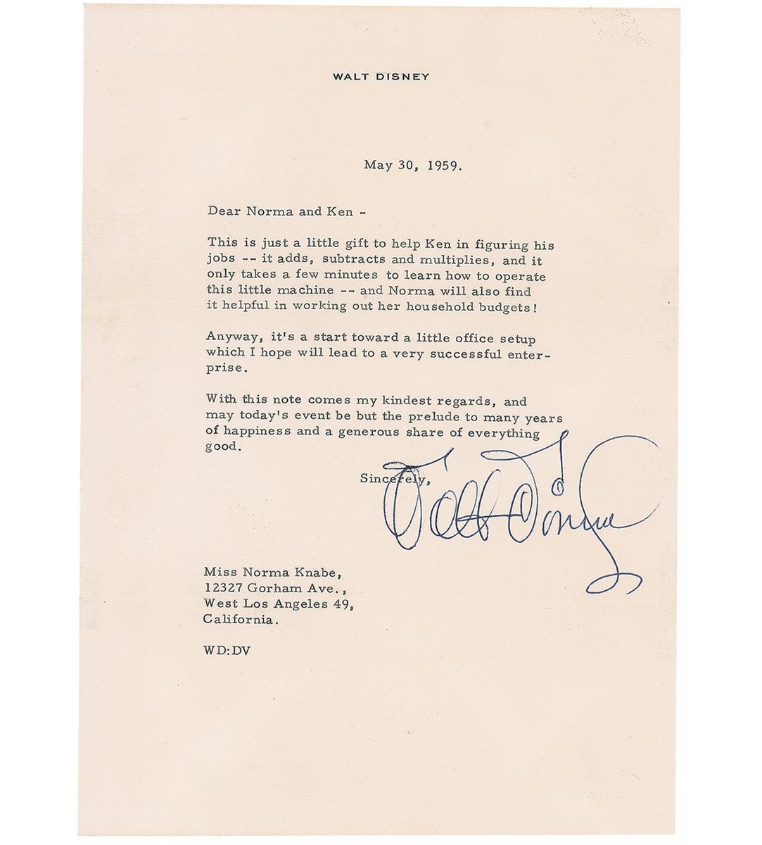 TLS, one page, 7.25 x 10, personal letterhead, May 30, 1959. Letter to Ken and Norma Knabe. In full: “This is just a little gift to help Ken in figuring his jobs—it adds, subtracts and multiplies, and it only takes a few minutes to learn how to operate this little machine—and Norma will also find it helpful in working out her household budgets! Anyway, it’s a start towards a little office setup which I hope will lead to a very successful enterprise. With this note comes my kindest regards, and may today’s event be but a prelude to many years of happiness and a generous share of everything good.” In fine condition, with some mild edge toning and some scattered light wrinkles.