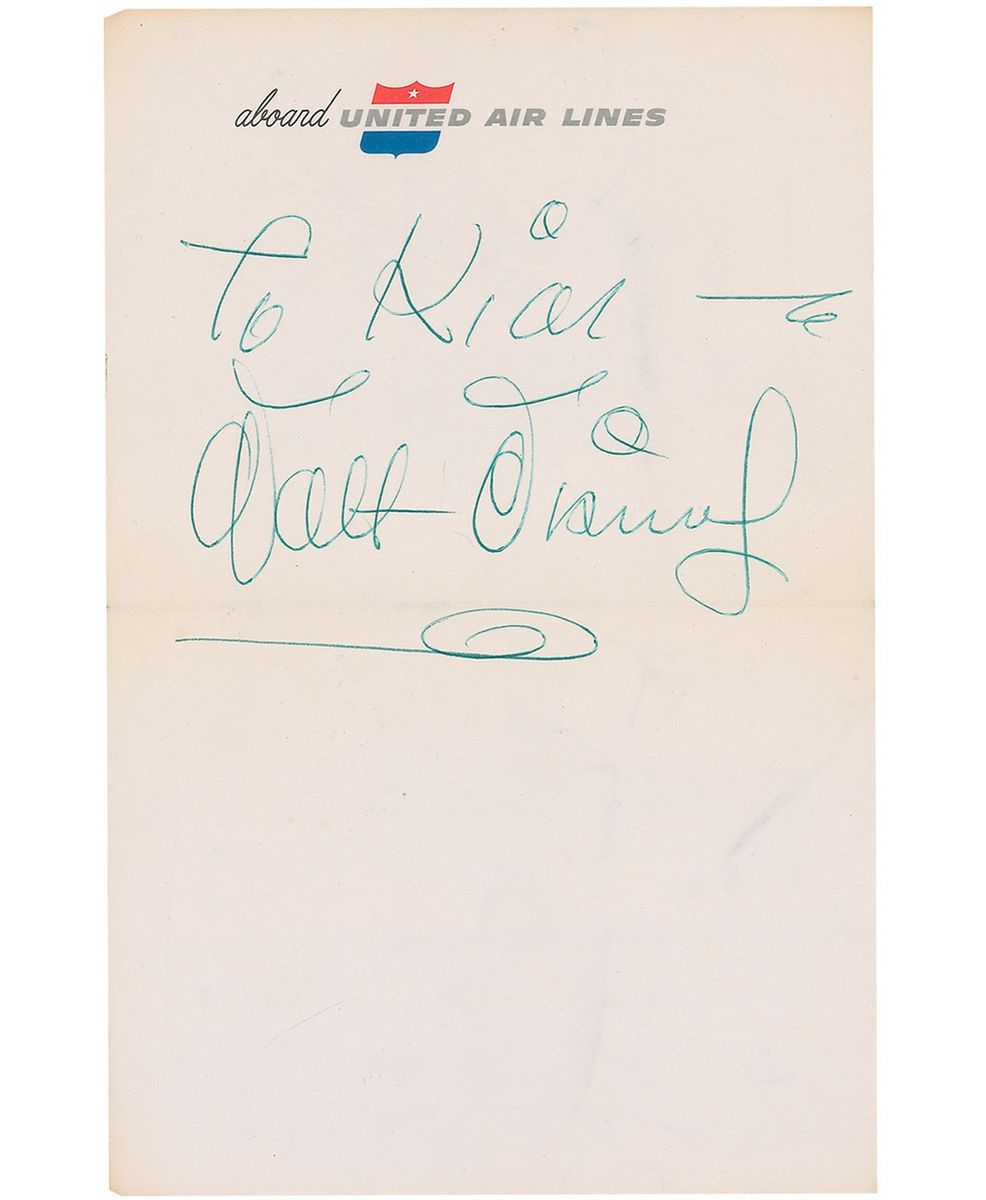 Crisp vintage green ballpoint signature and inscription, “To Kim—Walt Disney,” on an off-white 6 x 9.25 sheet of United Air Lines letterhead. Light surface creasing and toning, and the central horizontal fold slightly grazing the last letter of the signature, otherwise fine condition. Inscription could be matted out for a sizable signature display.