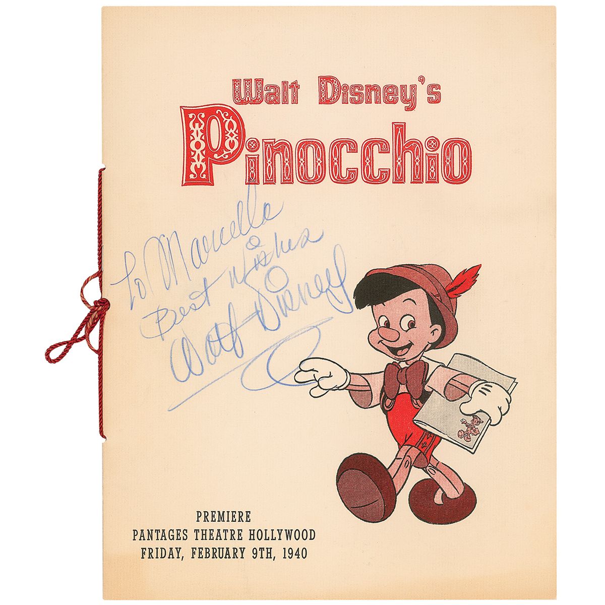 Vintage program for the premiere of Pinocchio at the Pantages Hollywood Theater on February 9, 1940, 8.25 x 10.75, four pages. Signed and inscribed in blue pencil on the front cover, “To Marcella, Best wishes, Walt Disney.” Program originates from a family member of Marcella Napp, the woman to whom the piece is inscribed, who was an assistant casting director at MGM during the 1930s and 1940s and one of the few women at the time to hold such a high-ranking studio position. In fine condition, with some mild toning to covers. Accompanied by a letter of provenance from Napp’s family, as well as a number of photocopied news articles pertaining to Napp.