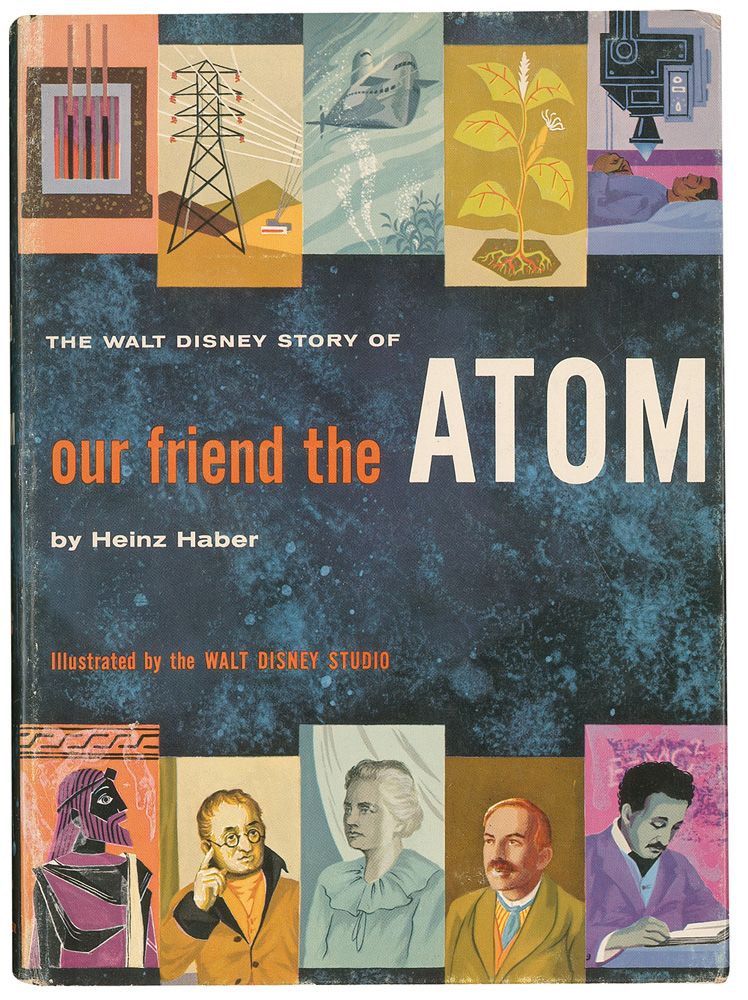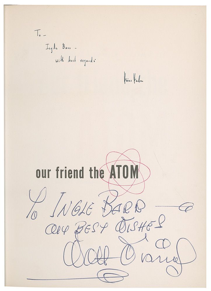 Signed book: Our Friend the Atom. First edition. NY: Simon & Schuster, 1965. Hardcover with dustjacket, 8.25 x 11.25, 165 pages. Signed and inscribed on the half-title page in blue ballpoint, “To Ingle Barr—All best wishes, Walt Disney.” Also signed and inscribed on the same page by author Heinz Haber. In fine condition, with pencil notation to reverse of first free end page, two small holes to front board, and two small holes and scattered wear and creases to dustjacket. Accompanied by the original Walt Disney Productions mailing panel addressed to Barr. One of the first examples of commercial “synergy,” this book was a tie-in to the film of the same name as well as an exhibit at Disneyland’s Tomorrowland.