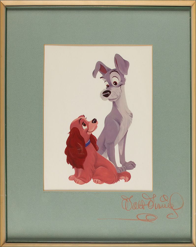 Original 14 x 18 light green mat, which originally held a Lady and the Tramp cel, signed in red artist’s pencil, “Walt Disney.” The mat is displayed with a modern-era color image of Lady and the Tramp, and bears the original studio pencil notation, “Walt Disney’s Lady and the Tramp,” written on the mat under the image. Mat is framed to an overall size of 15.25 x 19, with a Walt Disney Productions label affixed to the replacement backing. In fine condition.
