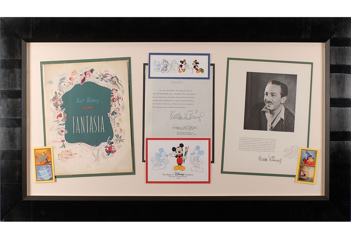 DS, signed “Walter E. Disney,” one page, 8.5 x 11, February 15, 1960. Waiver reads, “We, the undersigned, as Voting Trustees of WED Enterprises, Inc., being all of the shareholders of said corporation, waive notice of the annual meeting of the shareholders of said corporation held on the 15th day of February, 1960, and do hereby approve and adopt the foregoing as the minutes of said meeting.” Nicely signed at the conclusion by Disney and countersigned by William H. D. Cotrell. Attractively matted and framed with a Fantasia program cover, a book portrait of Disney, and several smaller color images of Disney characters, to an overall size of 29.75 x 23. In fine condition. Accompanied by a certificate of authenticity from Phil Sears. Walter Elias Disney founded the company in 1952, lending his initials to its name, in order to fund and oversee the development of Disneyland. In the the 1950s, the notion of building an amusement park without a Ferris wheel or roller coaster seemed like a losing proposition to many, so Disney had to fund it himself. He provided the startup money for the park from his own personal fortune, funneled through WED Enterprises. Since it was a separate entity from the Walt Disney Company, the development of the park could be conducted in secret and without disclosure to shareholders. Today, the company is called Walt Disney Imagineering. A fantastic relic from the early days of one of America's most famous places. Oversized.