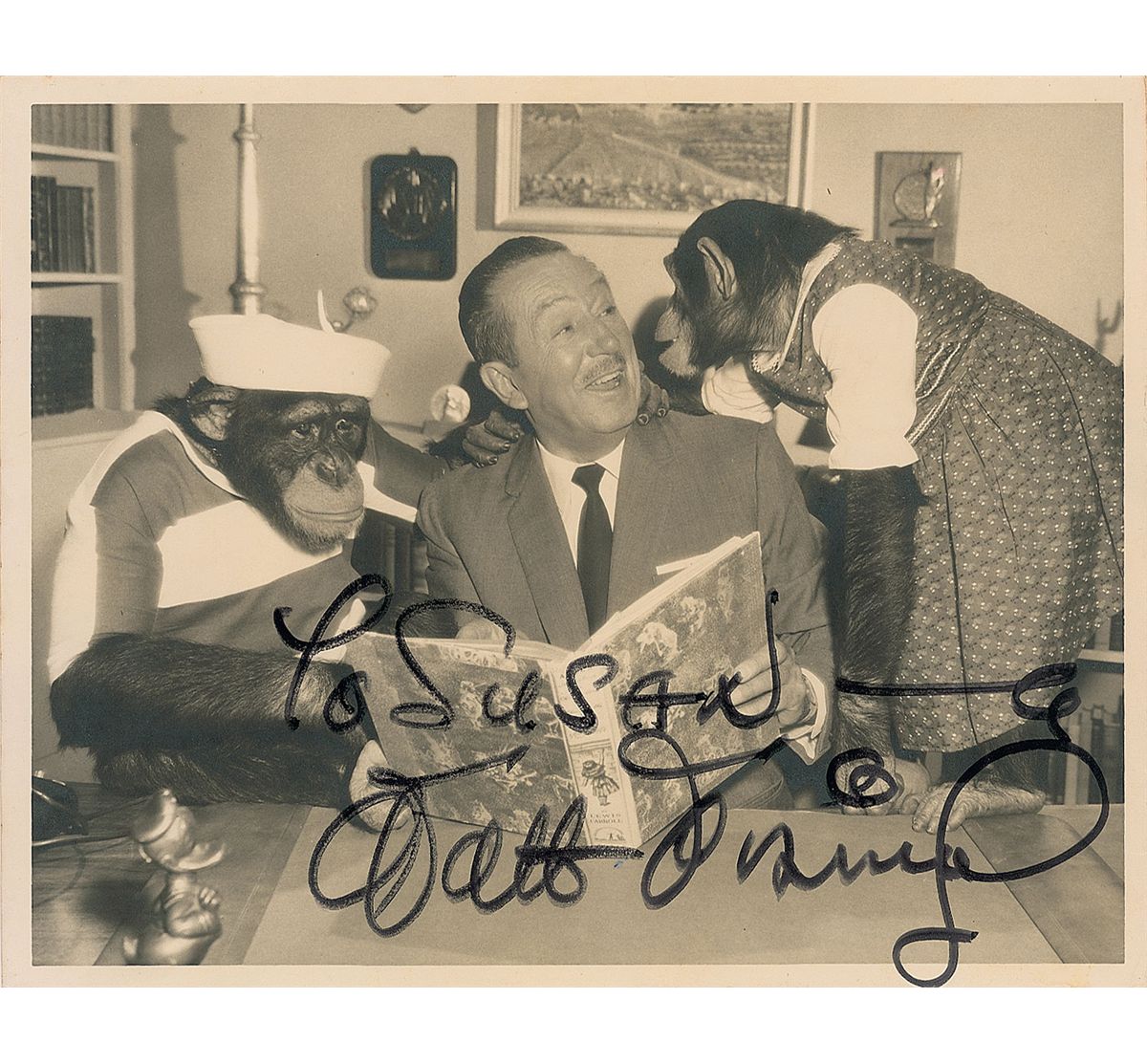 Vintage matte-finish 10 x 8 photo of Disney seated at his desk reading a book to two dressed chimpanzees, signed and inscribed in black felt tip “To Susan—Walt Disney.” In very good condition, with a few light bends and creases, silvering to darker areas of image, a bit of irregular ink adhesion to a few strokes of signature and inscription, and mounting remnants to reverse. Accompanied by a certificate of authenticity from Phil Sears.