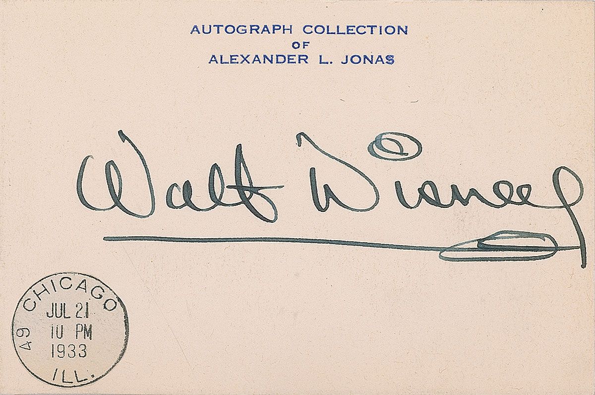 Vintage fountain pen signature, “Walt Disney,” on an off-white 4.5 x 3 custom-made collector’s card with a clipped July 21, 1933, Chicago, Illinois, postmark affixed to lower left corner. In fine condition, with a bit of scattered mild toning.