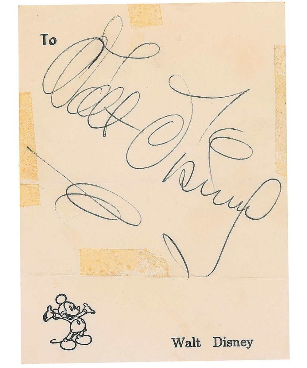 Vintage ballpoint signature, “Walt Disney,” on an off-white 4.25 x 5.5 sheet of Disney’s Mickey Mouse stationery. A horizontal fold through a small portion of last name of signature, old tape remnants around signature, and a few creases, otherwise fine condition.
