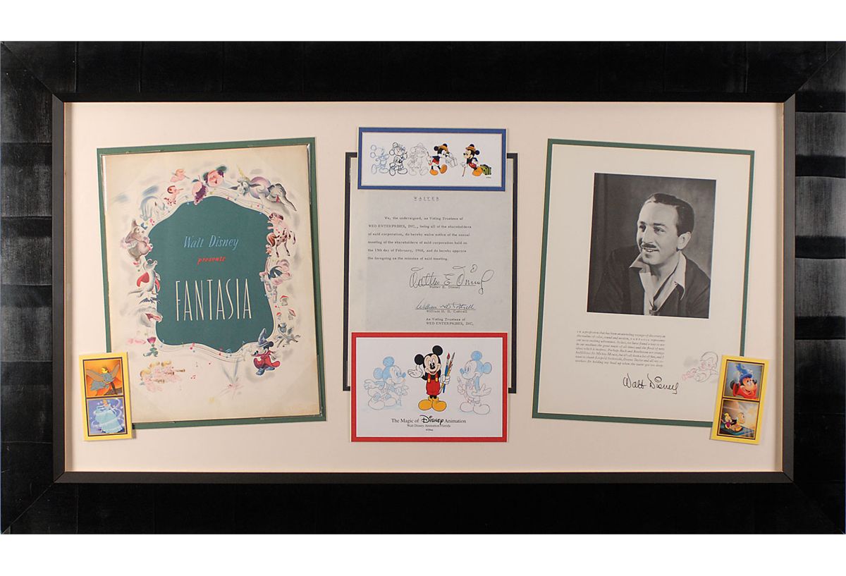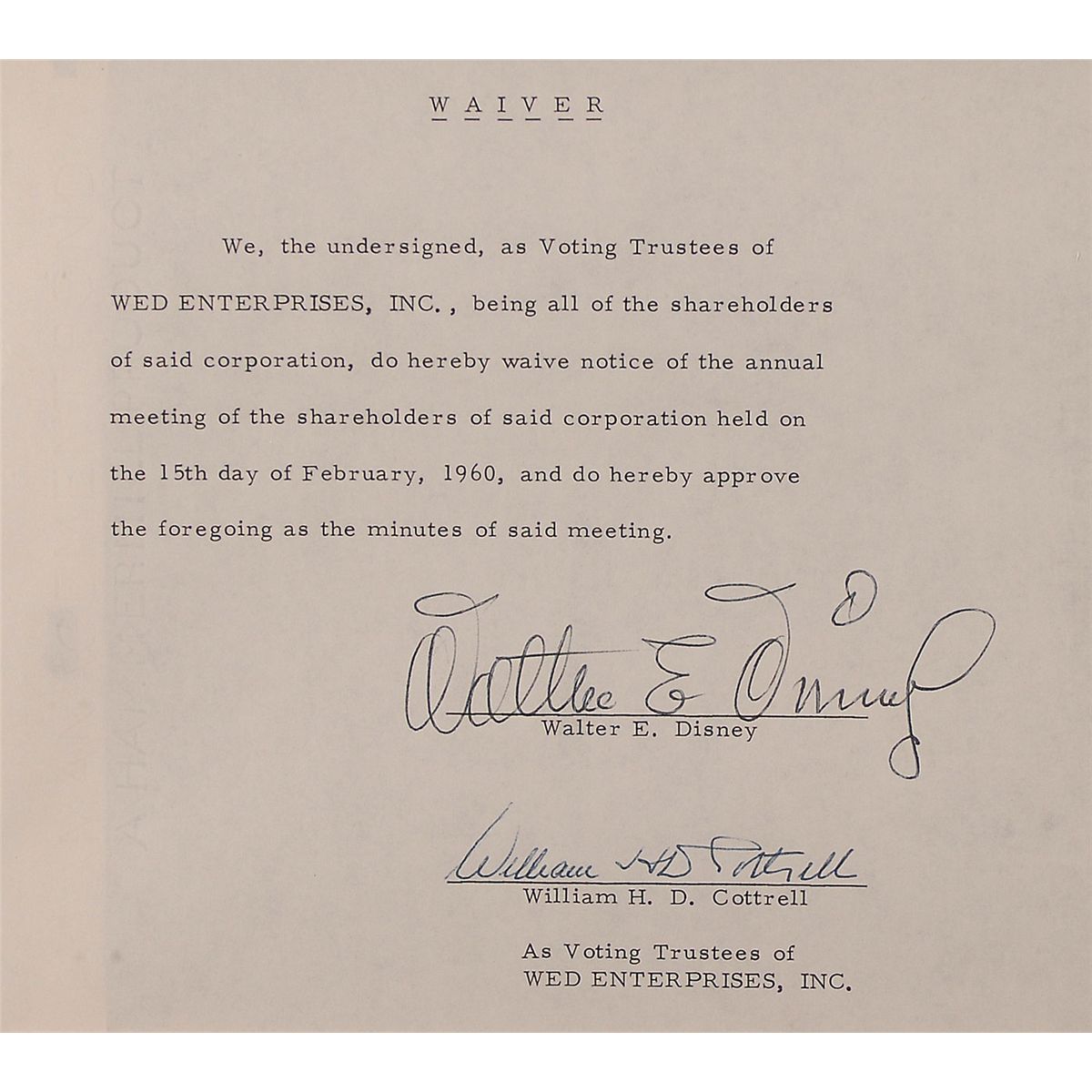DS, signed “Walter E. Disney,” one page, 8.5 x 11, February 15, 1960. Waiver reads, “We, the undersigned, as Voting Trustees of WED Enterprises, Inc., being all of the shareholders of said corporation, waive notice of the annual meeting of the shareholders of said corporation held on the 15th day of February, 1960, and do hereby approve and adopt the foregoing as the minutes of said meeting.” Nicely signed at the conclusion by Disney and countersigned by William H. D. Cotrell. Attractively matted and framed with a Fantasia program cover, a book portrait of Disney, and several smaller color images of Disney characters, to an overall size of 29.75 x 23. In fine condition. Accompanied by a certificate of authenticity from Phil Sears. Walter Elias Disney founded the company in 1952, lending his initials to its name, in order to fund and oversee the development of Disneyland. In the 1950s, the notion of building an amusement park without a Ferris wheel or roller coaster seemed like a losing proposition to many, so Disney had to fund it himself. He provided the startup money for the park from his own personal fortune, funneled through WED Enterprises. Since it was a separate entity from the Walt Disney Company, the development of the park could be conducted in secret and without disclosure to shareholders. Today, the company is called Walt Disney Imagineering. A fantastic relic from the early days of one of America's most famous places. Oversized.