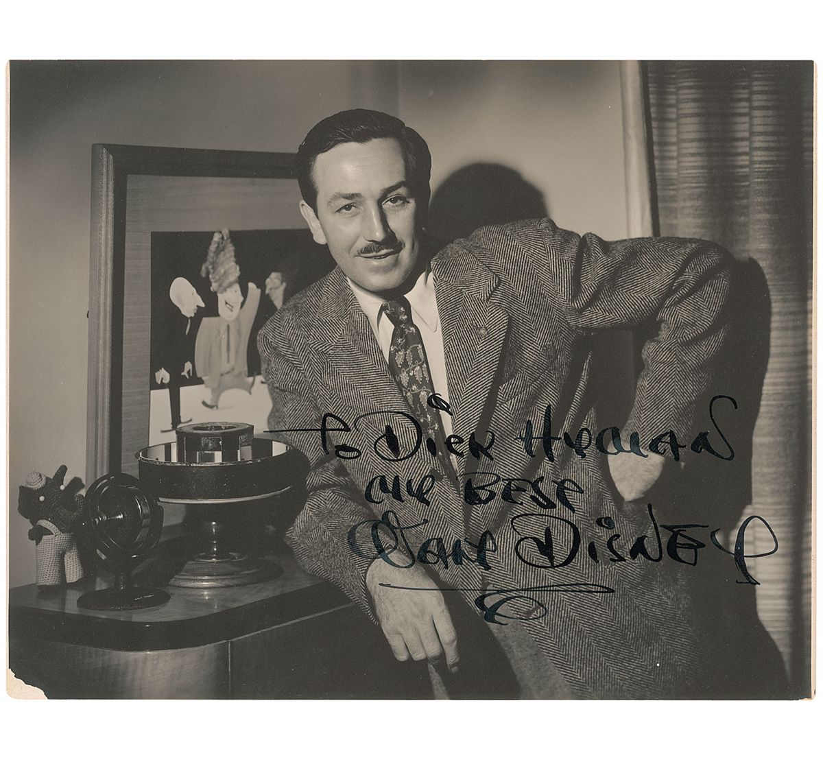 Vintage matte-finish 9.5 x 7.5 photo of Disney casually leaning on a table in his office, signed and inscribed in fountain pen, “To Dick Hyman, My best, Walt Disney.” Slightly trimmed edges and a small area of inconsequential surface loss to lower left corner, otherwise fine condition. A boldly signed distinguished portrait—the first of its kind we’ve seen.
