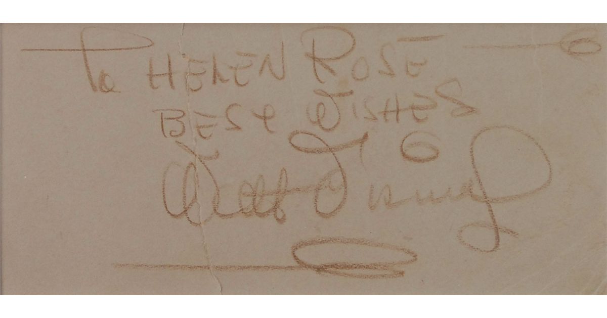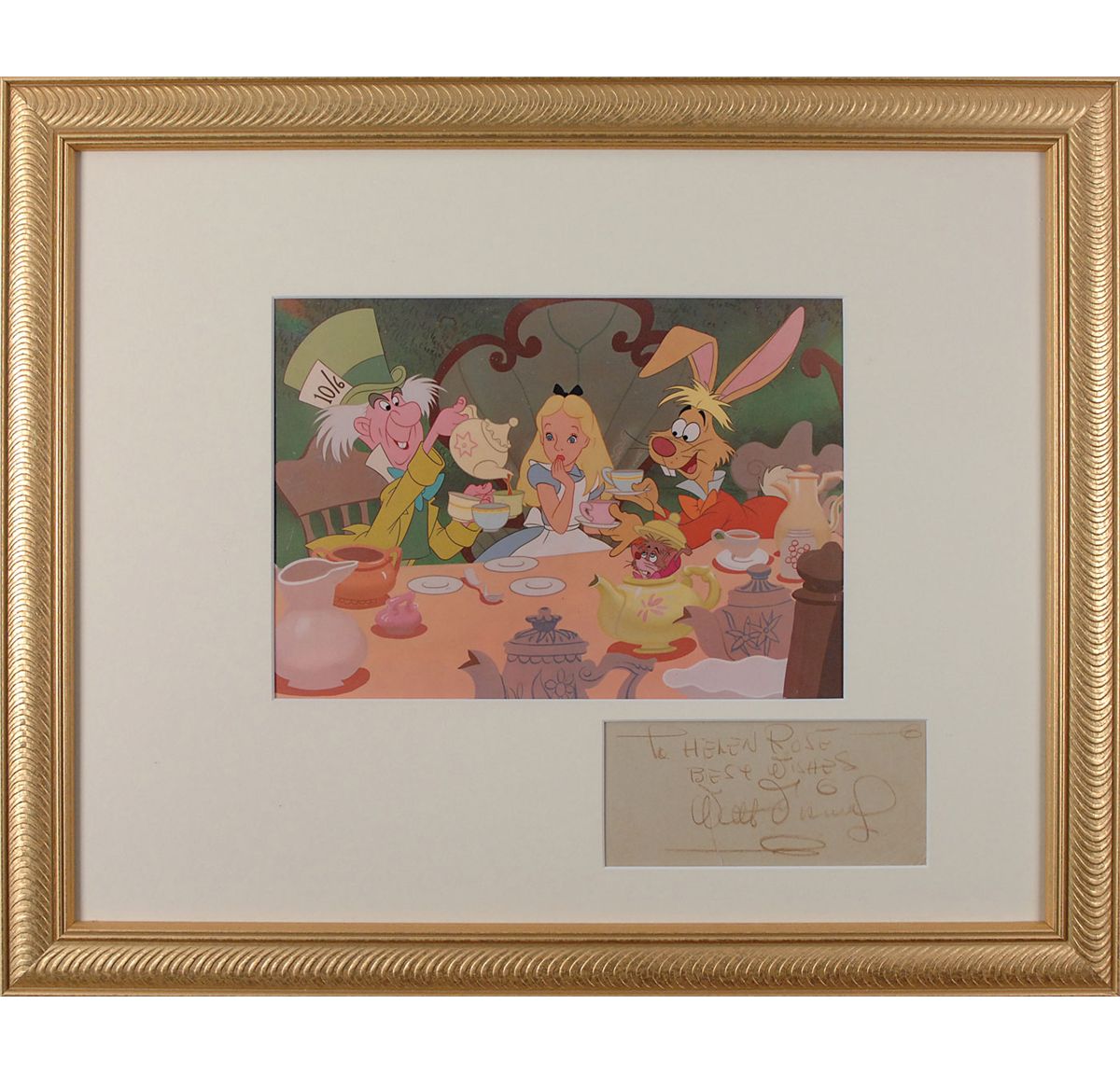 Vintage brown artist’s pencil signature and inscription, “To Helen Rose—Best wishes, Walt Disney,” on an off-white 6.5 x 3 piece of a presentation mat. Matted and framed with a color print from Alice in Wonderland to an overall size of 22.5 x 18.5. In very good condition, with a vertical separation to left side, affecting a couple letters of signature and inscription, and some other creases and wrinkles. Accompanied by a letter of authenticity from James Spence.