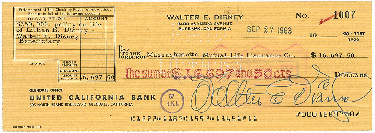 Personal check, 8.5 x 3, filled out in type and signed by Disney, “Walter E. Disney,” payable to Massachusetts Mutual Life Insurance Co. for $16,697.50, stamp-dated September 27, 1963. Typed memo reads, “$250,000 policy on life of Lillian B. Disney—Walter E. Disney, Beneficiary.” A light central vertical fold and expected cancellation holes and stamps, one lightly over portion of signature, otherwise fine condition.