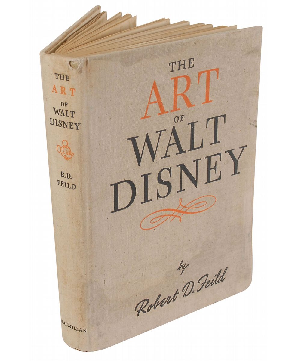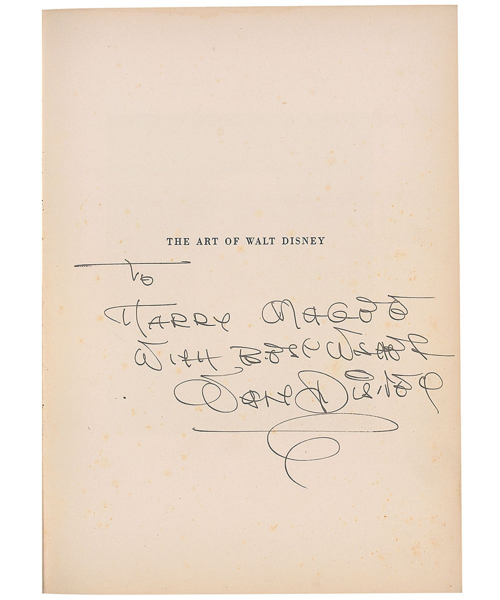 Signed book: The Art of Walt Disney. First edition. NY: The Macmillan Company, 1942. Hardcover, 8.5 x 11.25, 290 pages. Signed and inscribed on the half-title page, “To Harry McGee, with best wishes, Walt Disney.” Autographic condition: scattered light foxing to signed page, as well as some trivial dampstaining along top edge, otherwise fine. Book condition: G+/None. Tan cloth-covered boards; edges worn, with small tears in cloth at corners and spine-ends; soiling to exterior, rear endpapers, and a few internal pages (heavy soiling to pages 230-1); water damage to front cover; last several pages creased; upper 4? of rear internal hinge cracked; light foxing to textblock edges and first/last few pages.