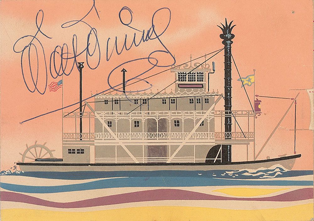 Original beautifully illustrated Disneyland Hotel tri-fold children's menu from 1957, measuring 7 x 5 closed and opening to a size of 21 x 5, featuring delightful images of Dumbo and Tinkerbell inside as well as a map of Disney’s ‘hub’ on the back cover, prominently signed on the front in bold blue ballpoint, “Walt Disney.” In fine condition. A positively exquisite memento from Disneyland’s second year in existence.