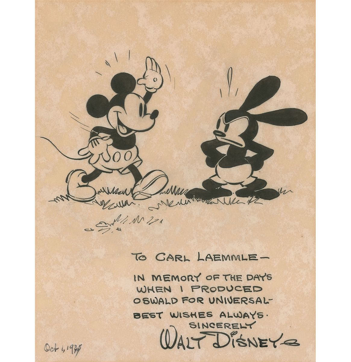 Incredibly rare original vintage signed and inscribed pen and ink sketch of Mickey Mouse and Oswald the Lucky Rabbit on an off-white 7 x 9 sheet of parchment-type paper, presented to Universal Studios founder Carl Laemmle on the 20th anniversary of the building of Universal Studios. This drawing and signature, though not in Disney’s hand, was done under Disney’s direction by artist Hank Porter. Sketch shows Mickey walking towards Oswald waving his hand, with Oswald looking fairly unhappy at seeing Mickey as he has his hands on his hips. Inscribed underneath, “To Carl Laemmle—In memory of the days when I produced Oswald for Universal—Best wishes always, Sincerely, Walt Disney.” Sketch is dated in the lower left by the Laemmle family, “Oct 1, 1935.” In very fine condition.