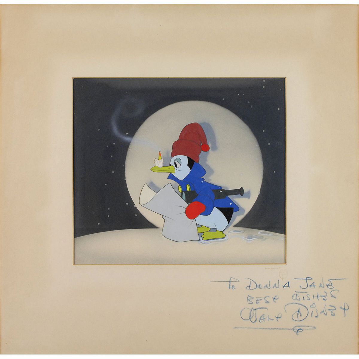 Original hand-painted studio Art-Prop set-up from The Cold-Blooded Penguin segment of The Three Caballeros prepared at the studio for presentation. The cel has been trimmed to the outline of the figure, as was customary, and is set against a background prepared by the Walt Disney Studio for sale by the Courvoisier Galleries. The 8.5 x 7.5 cel depicts Pablo the Penguin, a melting candle on his nose, after he has sailed past ‘the Juan Fernandez Islands where Robinson Crusoe once lived and still does apparently.’ Cel is housed in its original cream 14.5 x 14 mat. Penned in another hand at mat edge beneath cel is, “From Three Caballeros,” with encircled Walt Disney Productions “WDP” stamped at right. Signed and inscribed on the mat in blue artist’s pencil, “To Donna Jane, Best wishes, Walt Disney.” In very good condition, with some light rippling to cel and mild toning to mat, and restoration to the paint on the characters, which does not match the final version. A presentable and seldom-seen example from one of Disney’s more underrated productions.