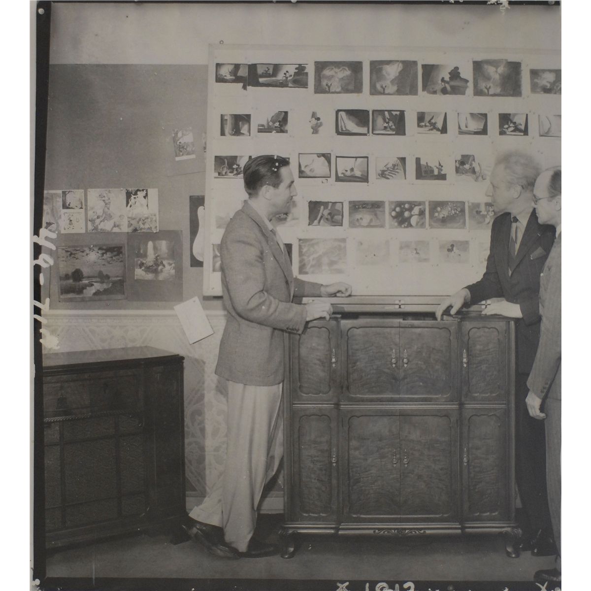 Enormous unsigned original 37 x 41 gelatin silver print of Walt Disney, Deems Taylor, and Leopold Stokowski discussing ideas for the 1940 film Fantasia. Soft handling creases, tack holes to corners, noticeable surface chipping to the head area, and a tiny tear to lower left edge, otherwise fine condition. One of the most innovative and influential animated films ever made, Fantasia combined unprecedented abstract animation set to classical music conducted by Stokowski. A truly spectacular and impressive image of these creative masterminds at work.