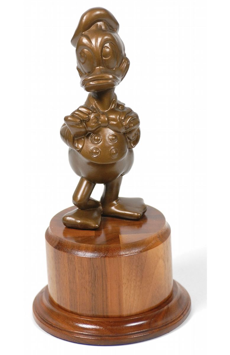 A Disney Hyperion-style ‘Duckster’ award. These statues were distributed at a special ceremony sometime in the early-1970s to longtime studio employees who had been with the company continuously from the days when the studio was located on Hyperion Avenue in Hollywood. Award stands on a wooden base, measures approximately 9.5? tall, with a “WDP” copyright stamp on the back of the right foot. In fine condition. These awards on wooden bases were given after Walt died to honor those living survivors of the original Hyperion Studio before the move to Burbank in 1939. They originally had decal labels which are most often removed as families and aged recipients, as did not want it know they had sold the statue. Most experts agree, these date to a dinner in 1973.
