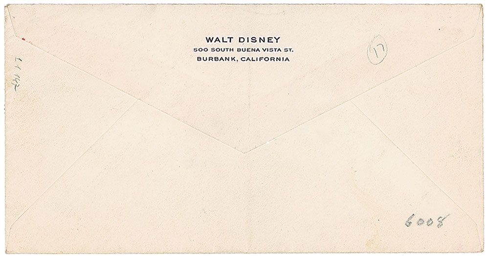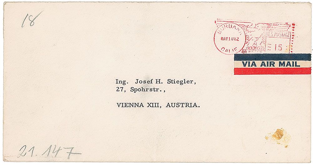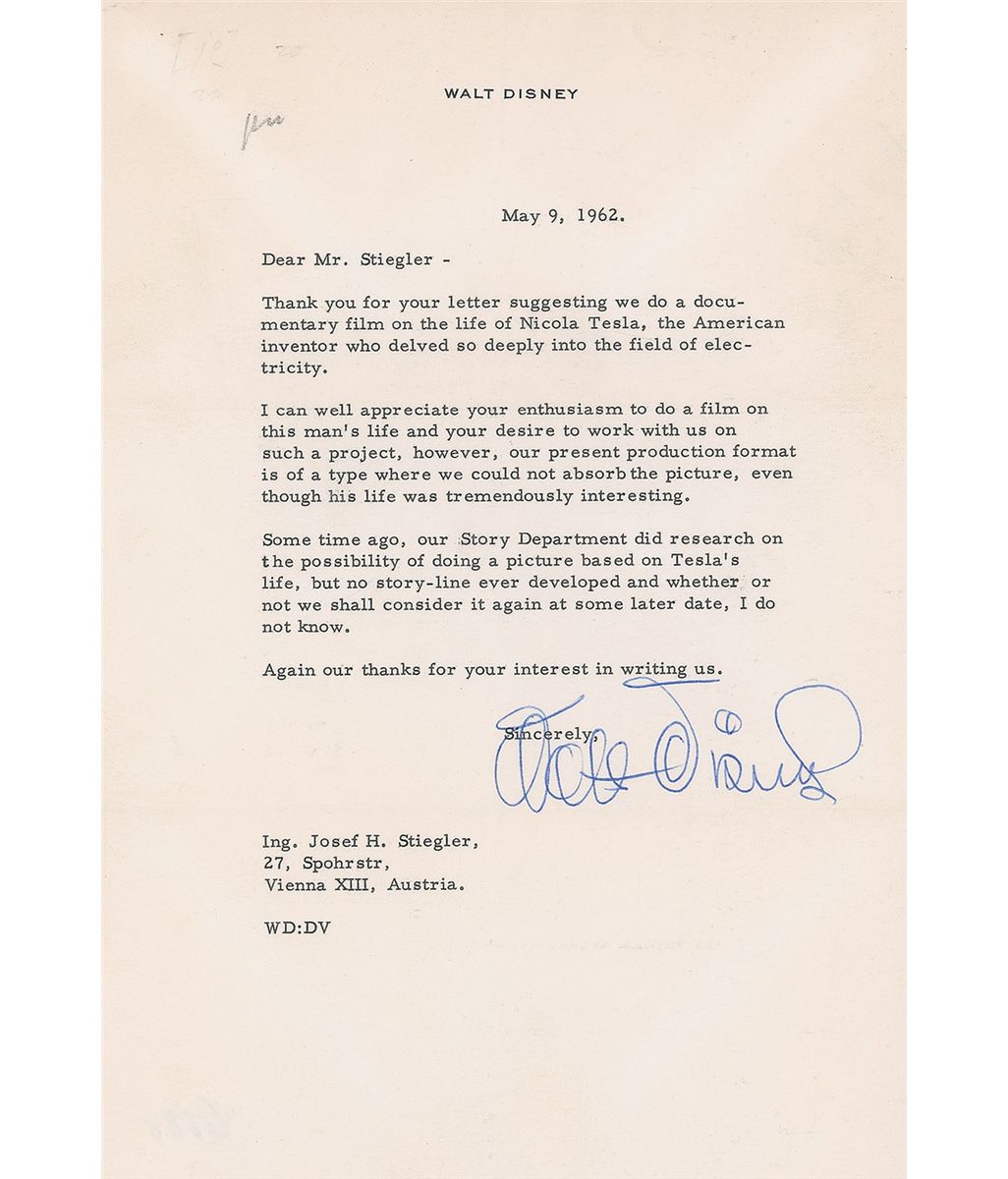 TLS, one page, 7 x 10.25, personal letterhead, May 9, 1962. Letter to a gentleman in Austria. In full: “Thank you for your letter suggesting we do a documentary film on the life of Nicola Tesla, the American inventor who delved so deeply into the field of electricity. I can well appreciate your enthusiasm to do a film on this man’s life and your desire to work with us on such a project, however, our present production format is of a type where we could not absorb the picture, even though his life was tremendously interesting. Some time ago, our Story Department did research on the possibility of doing a picture based on Tesla’s life, but no story-line ever developed and whether or not we shall consider it again at some later date, I do not know. Again thanks for your interest in writing us.” In fine condition, with a trivial shade of toning to top portion of page and a couple of small pencil notes and remnants. Accompanied by the original mailing envelope.