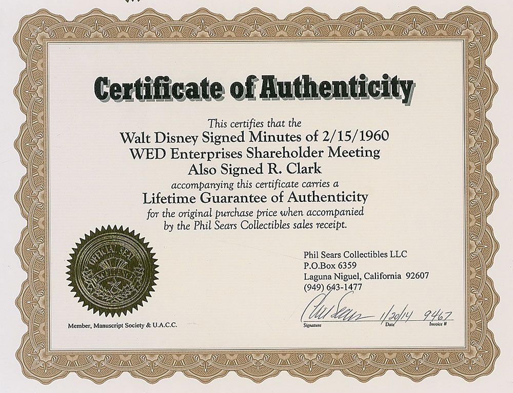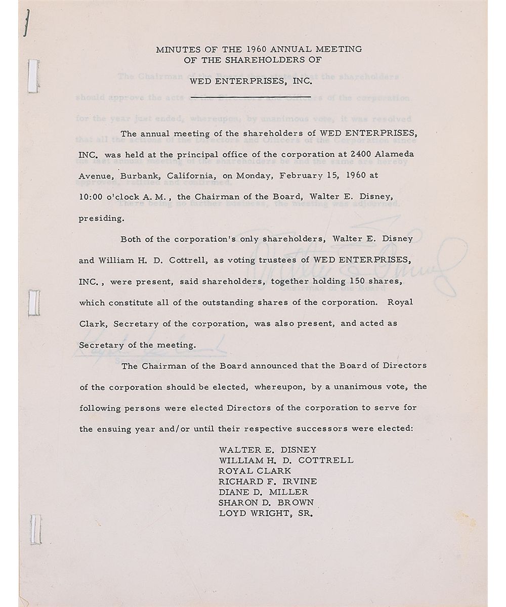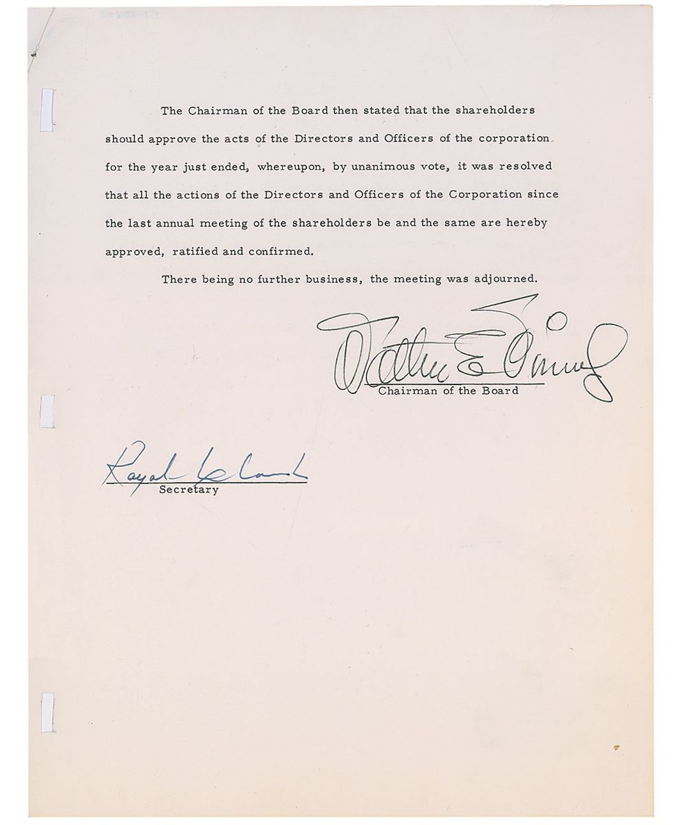 DS, signed “Walter E. Disney,” two pages, 8.5 x 11, February 15, 1960. Minutes of the 1960 annual meeting of the shareholders of WED Enterprises, Inc. In part: “Both of the corporation’s only shareholders, Walter E. Disney and William H. D. Cottrell, as voting trustees of WED Enterprises, Inc., were present…Royal Clark, Secretary of the corporation, was also present…by a unanimous vote, the following persons were elected Directors of the corporation to serve for the ensuing year…Walter E. Disney, William H. D. Cottrell, Royal Clark, Richard F. Irvine, Diane D. Miller, Sharon D. Brown, Loyd Wright, Sr.” Beautifully signed at the conclusion in ballpoint by Disney, and countersigned by the secretary, Royal Clark. In fine condition, with expected document wear. Accompanied by a certificate of authenticity from Phil Sears and an unsigned color photo of Disney with Mickey Mouse. An interesting document in which Disney names his daughters, Diane and Sharon, as members of the board of directors of WED Enterprises, now called Walt Disney Imagineering, boldly signed by Disneyland’s mastermind.