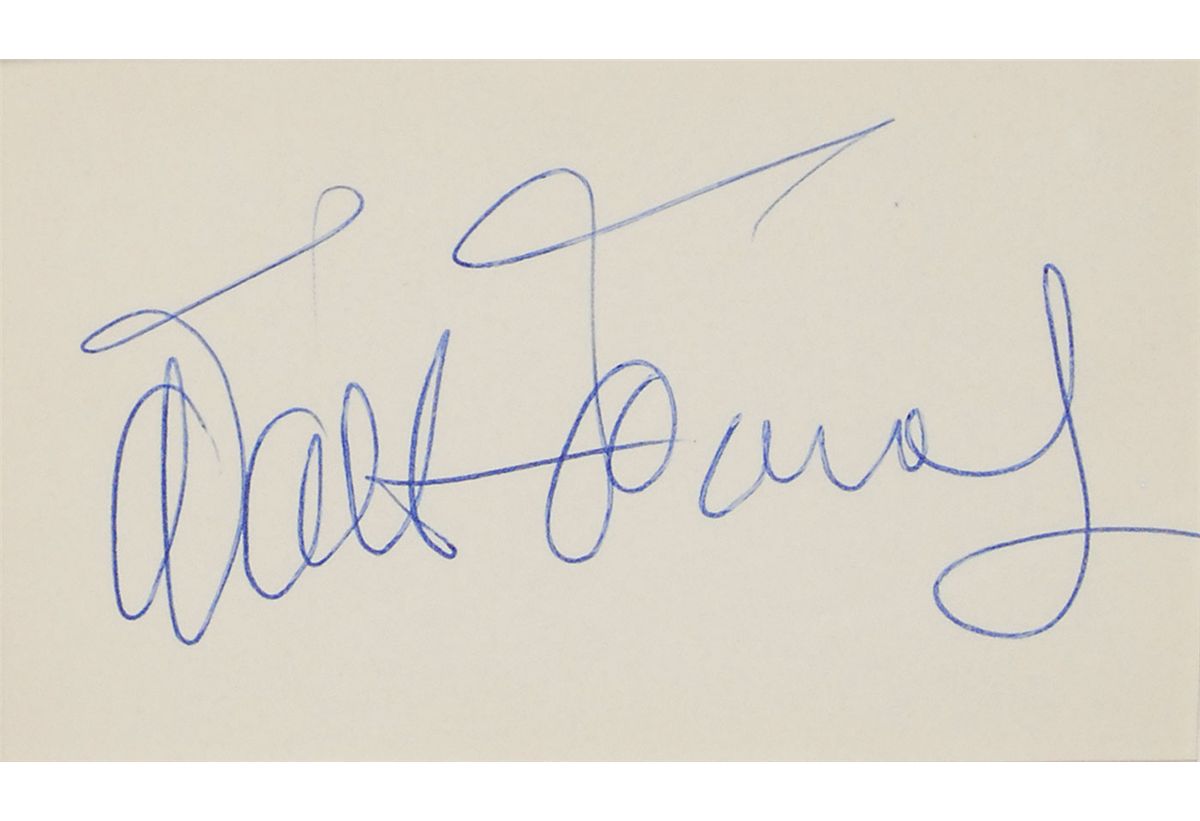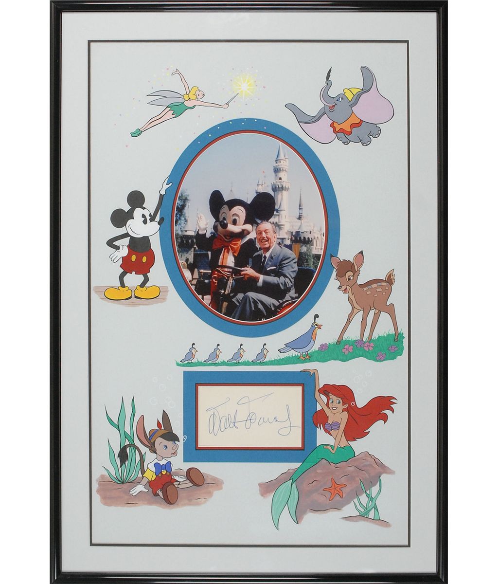 Fabulously large ballpoint signature, “Walt Disney,” on an off-white 5 x 3 card. Beautifully double-matted and framed with a color portrait of Disney and Mickey Mouse, with six different Disney characters expertly hand-carved and painted into the mat, to an overall size of 19 x 28. In very fine condition. Accompanied by a certificate of authenticity from Phil Sears. Oversized.