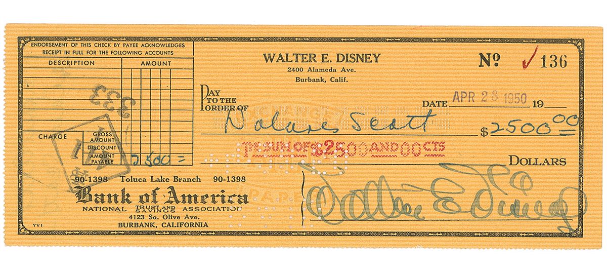 Personal check, 8.25 x 3, filled out in another hand and signed by Disney, “Walter E. Disney,” payable to Dolores Scott for $2500, April 23, 1950. In fine condition, with three vertical folds (one passing between his middle initial and last name), and expected bank stamps and cancellation holes (holes trivially affecting a portion of the first letter in his signature). Scott was Walt Disney’s influential personal secretary who worked for him for 35 years, beginning in 1930. She served as the ‘gatekeeper’ for anyone wanting to meet with Disney and oversaw his personal finances. A wonderful association with this ‘unsung hero’ of Disney’s greatest years, highlighted by the extremely bold example of his classic whimsical signature.