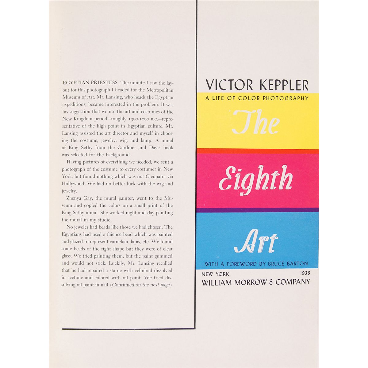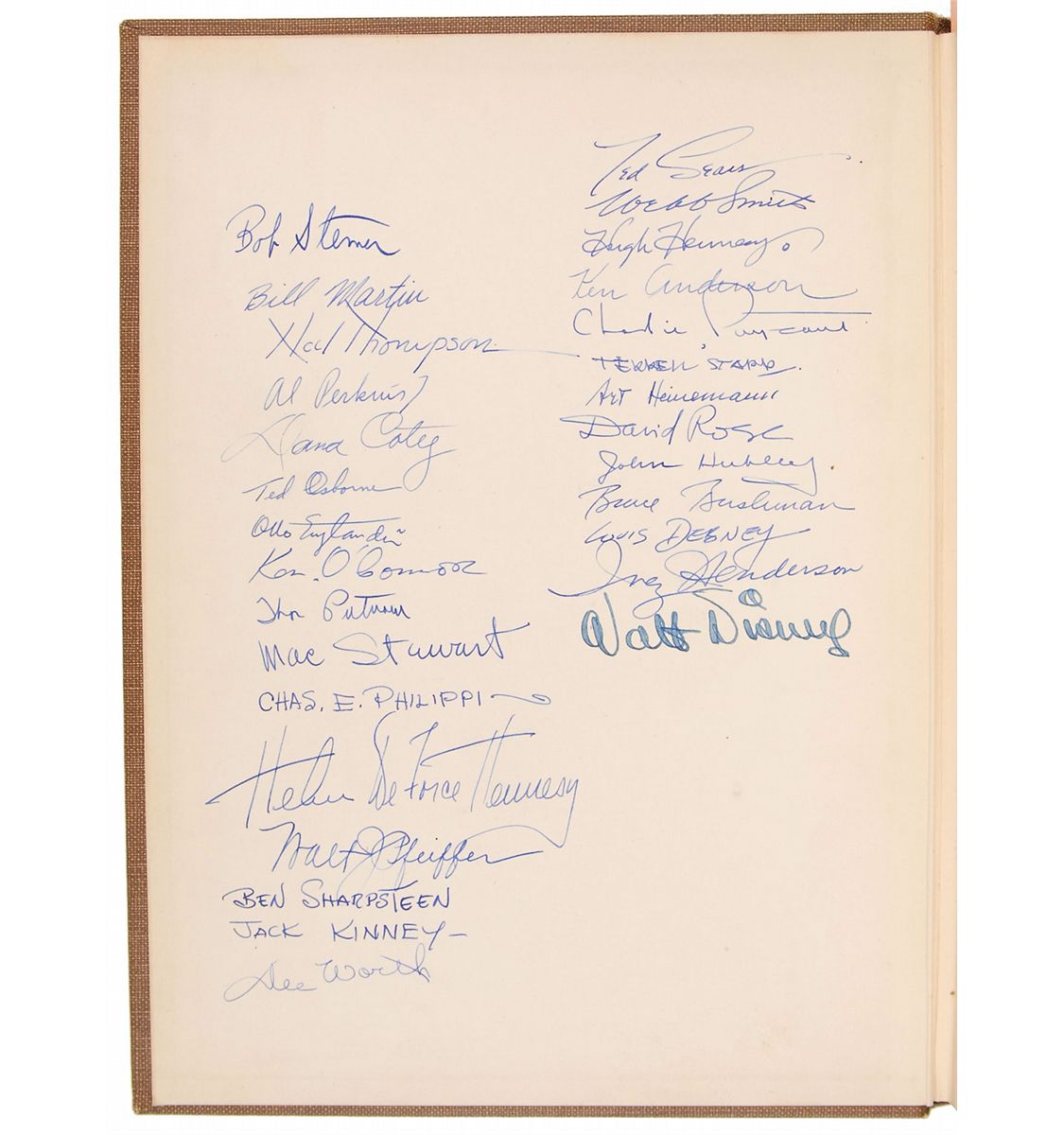 Signed book: The Eighth Art by Victor Keppler. First edition. NY: William Morrow & Company, 1938. Hardcover, 9.25 x 12.25, 266 pages. Signed on the front pastedown in fountain pen by Walt Disney and 28 of Disney's artists, directors, and other employees. Also signed on the first free end page by Keppler. Additional signers include: Al Perkins (researcher for Alice in Wonderland), Dana Coty (writer for Donald's Nephews, a Donald Duck cartoon), Ted Osborne (story writer and cartoonist), Otto Englander (writer who worked on Snow White, Fantasia, and Dumbo), Ken O'Connor (art director and layout artist), Thor Putnam (layout artist), Mac Stewart (layout artist), Charles Philippi (layout artist), Helen De Force Hennesy (first Disney librarian), Walt J. Pfeiffer (childhood friend of Disney and studio executive), Bill Sharpsteen (director), Jack Kinney (animator), Dee Worth (secretary), Ted Sears (first head of Disney's story department), Webb Smith (credited with creating the first storyboard), Hugh Hennesy (layout artist), Ken Anderson (art director and writer), Charlie Payzant (background artist), Terrell Stapp (art director), Art Heinemann (writer and animator), David Rose (artist), John Hubley (background and layout artist), Bruce Bushman (layout artist), Louis Debney (producer of Mickey Mouse Club), and three others. Rear pastedown also bears an original sticker from the legendary Stanley Rose Bookshop, the unofficial Hollywood Boulevard clubhouse of countless notable writers and celebrities. Autographic condition: fine. Book condition: VG+/None. The majority of these signers were involved in the making of Disney’s greatest classics, including Snow White, Fantasia, and Cinderella, as well as earlier films and shorts. A positively remarkable assemblage of the behind-the-scenes staff—along with their revered leader—that came together to produce the greatest animated features ever put to screen.