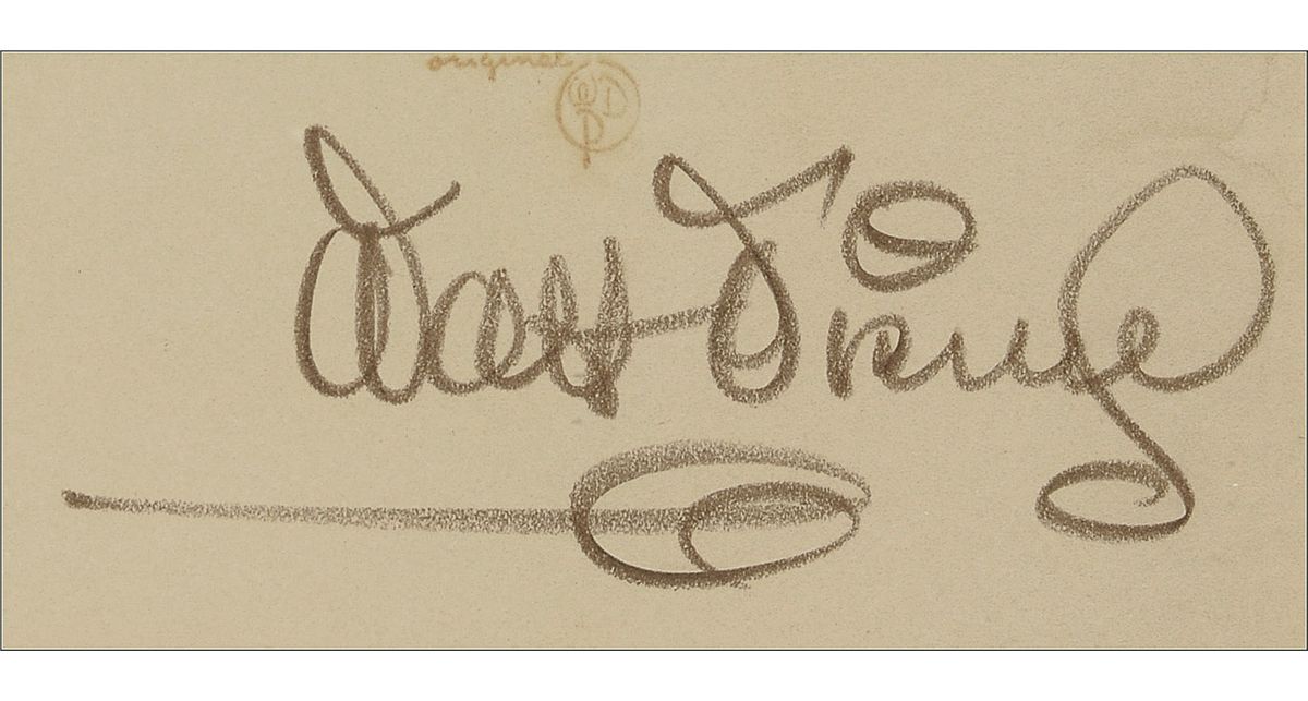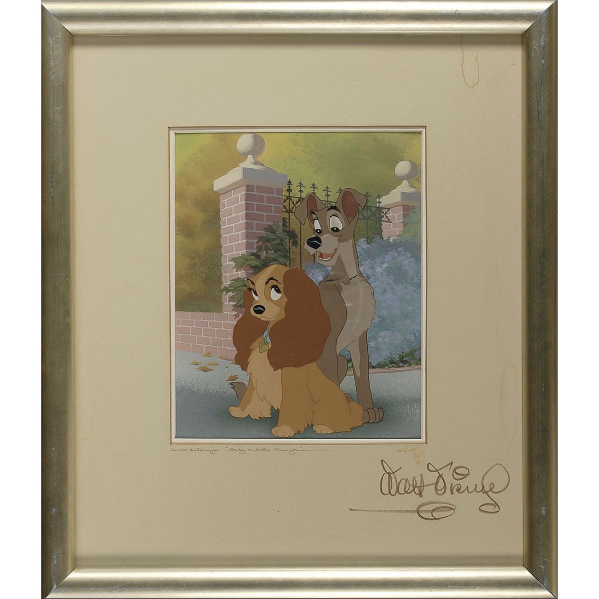 Vibrant Walt Disney Studio Art-Props setup. Cel depicts Lady and Tramp standing on a street corner. The cel has been trimmed to the outline of both figures, as was customary when being prepared for presentation, and is set against a colorfully hand-painted 8 x 10.25 background. Cel is housed in its original cream 14.75 x 17.75 mat with the pencil caption “Walt Disney’s ‘Lady and the Tramp’” and the red “Original WDP” ink stamp; the mat is boldly signed in black artist’s pencil, “Walt Disney.” Professionally de-acidified and archivally framed (with an additional acid-free mat beneath the original, signed mat) to an overall size of 17.25 x 20. This would have been made prior to the release of the film and used for publicity purposes. In fine condition, with a few small ripples to Tramp’s neck resulting in some slight lifting of paint, and some scattered mild damp staining to mat, not affecting overall visual appeal. A splendid and seldom-seen signed example from Disney’s timeless love story.