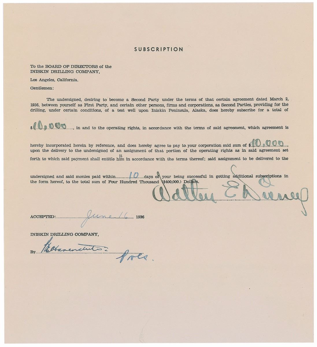 Choice DS, signed “Walter E. Disney,” one page, 8.5 x 9.25, June 16, 1936. Document in which Disney commits $10,000 to provide for “the drilling, under certain conditions, of a test well upon Iniskin Peninsula, Alaska.” Beautifully signed at the conclusion by Disney and countersigned by the president of the Iniskin Drilling Company. In very fine condition. Other investors in this scheme included Darryl F. Zanuck and Hal Roach, and they began drilling their first well in 1938. After two years of preparation, the animation work on Snow White and the Seven Dwarfs had begun in February 1936, just a few months before Disney signed this document. Most of the Hollywood world doubted that his concept for the first animated feature film would be successful, but when the film was released at the end of 1937 it dwarfed expectations and assumed the record for highest grossing sound film at the time. A gorgeously signed and well-preserved document from this critical moment in Disney history.