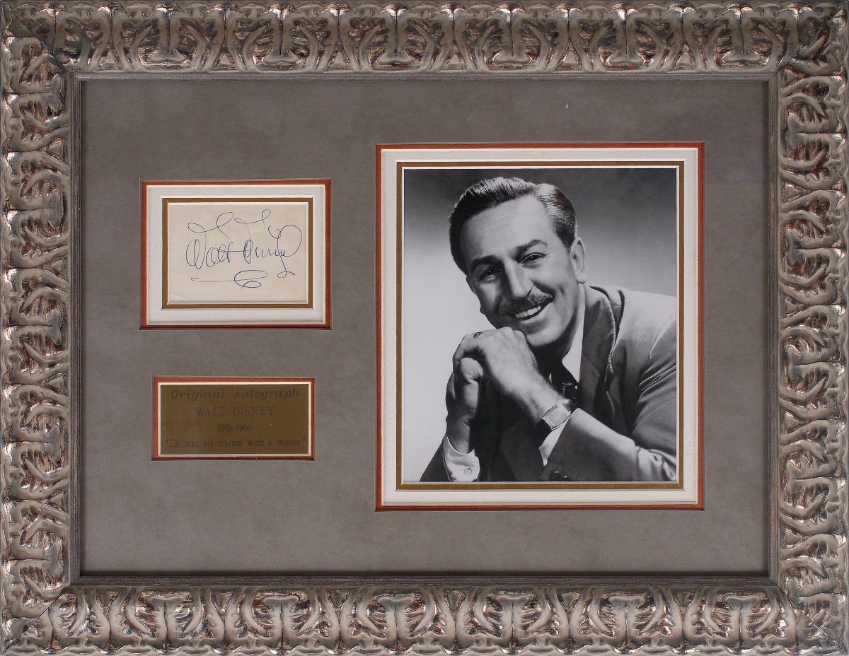 Large and crisp ballpoint signature, “Walt Disney,” on an off-white 3.5 x 2.5 slip. Archivally triple-matted and framed with a portrait and plaque to an overall size of 21.5 x 16.5. In fine condition, with a couple trivial stains to the slip. Accompanied by a certificate of authenticity from noted Disney expert Phil Sears.
