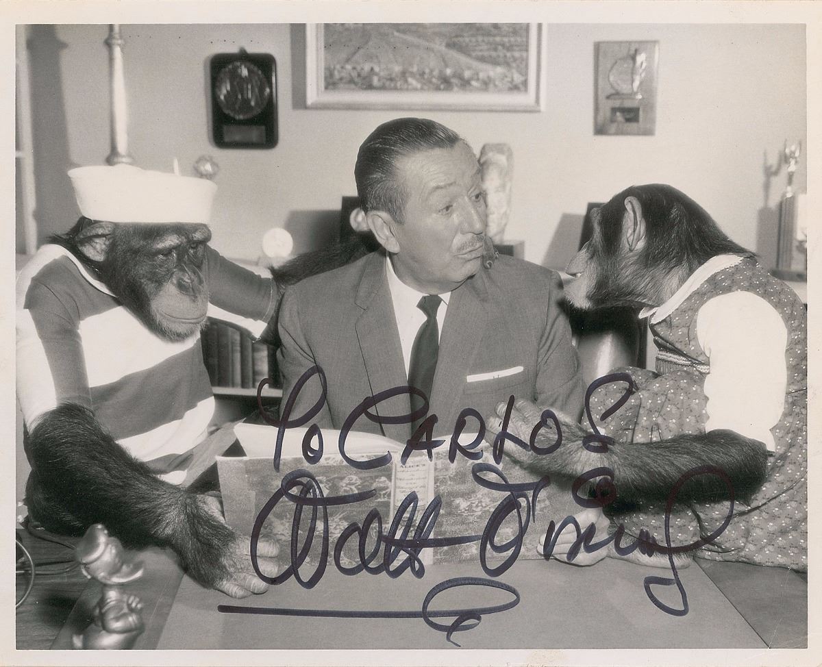 Amusing matte-finish 10 x 8 photo of Disney reading Alice’s Adventures in Wonderland to two chimpanzees sitting on his desk, with one chimp in a dress and the other dressed as a sailor, nicely signed and inscribed in black felt tip, “To Carlos, Walt Disney.” In fine condition, with a crease to lower right corner. A humorous image boasting a very bold, large signature.