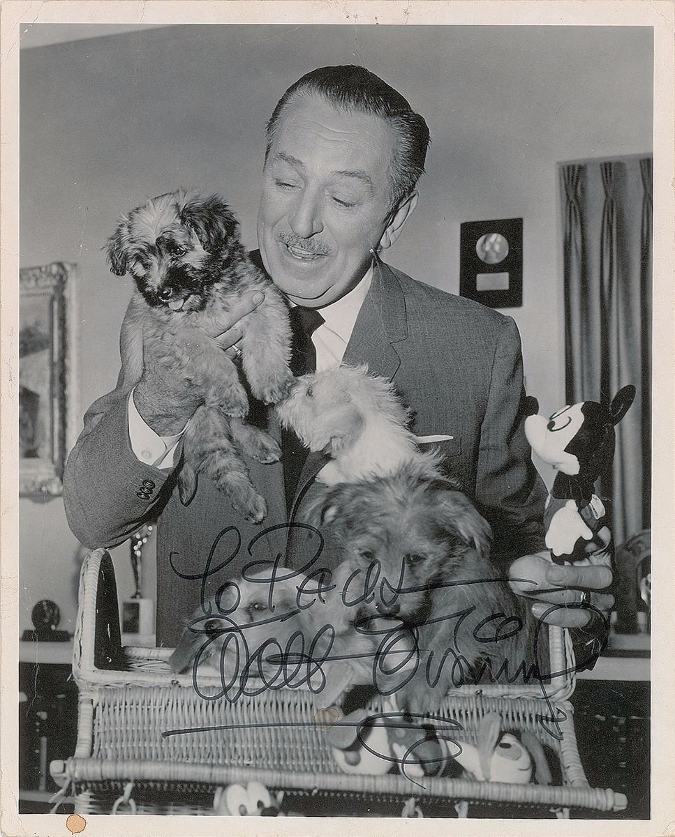 Charming vintage matte-finish 8 x 10 photo of Disney with a basket of puppies and a stuffed Mickey Mouse doll, prominently signed and inscribed in fountain pen, “To Paul, Walt Disney.” In very good condition, with a small stain to lower border, several tack holes to top edge, and moderate overall creasing. Accompanied by a full letter of authenticity from JSA.