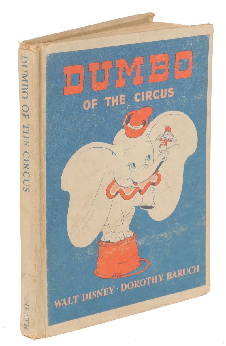 Signed book: Dumbo of the Circus. Later printing. Boston: D. C. Heath and Company, 1948. Hardcover, 6.25 x 8.5, 90 pages. Signed and inscribed opposite the title page in dark green crayon, “To Sarabeth Parker, Best wishes, Walt Disney.” Autographic condition: fine, with some light creasing and toning to signed page. Book condition: G+/None. Accompanied by a certificate of authenticity from noted Disney expert Phil Sears. According to a previous owner, this book was given to her mother by an aunt who was married to writer Dalton Reymond, a friend of Disney’s who worked on Song of the South. A wonderful, very large example of Disney’s autograph inside a classic Disney title.