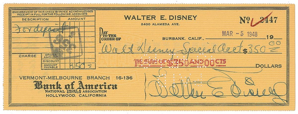 Personal check, 8.5 x 3, filled out in another hand and signed by Disney, “Walter E. Disney,” payable to Walt Disney—Special Acct. for $350, stamp-dated March 5, 1948. In fine condition.