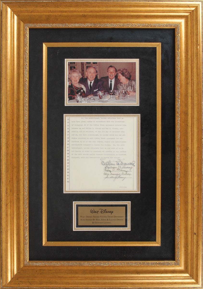DS, signed “Walter E. Disney,” one page, 7.5 x 7.75, December 1, 1945. Assignment of Walt Disney Productions common stock for Sharon Mae Disney, in part: “We, the said undersigned, do hereby waive any and all rights provided by us of the said shares, rights and certificates hereinabove signed to Sharon Mae Disney. We…hereby stipulate that we and each of us do not desire or elect to purchase our portion or any portion of the said shares and/or Trustee Certificates hereinabove assigned, sold and transferred to Sharon Mae Disney.” Signed at the conclusion by Disney in fountain pen, and countersigned by Lillian Disney, Roy Disney, Edna Francis Disney, and Gunther Lessing. Impressively triple-matted and framed with an engraved nameplate and an image of Walt and Roy Disney with their wives to an overall size of 21.75 x 30.75. Trimmed from a larger document and in fine condition. Oversized.