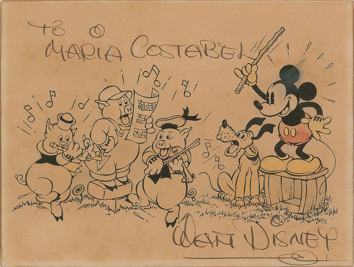 Fantastic color 9.25 x 7 print showing Mickey Mouse and Pluto conducting a band of the Three Little Pigs, signed and inscribed in fountain pen, “To Maria Costabel, Walt Disney.” In very good to fine condition, with overall toning and soiling. A wonderful image boasting a large, early Disney signature.