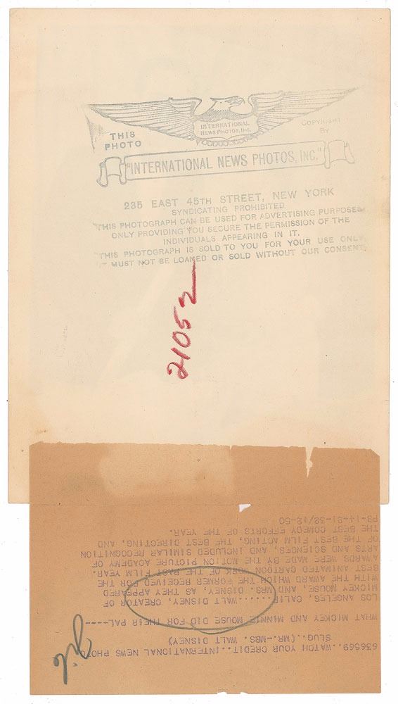 Sharp original vintage circa 1932 matte-finish 6.5 x 8.5 lightweight photo of Walt Disney and his wife posing with the Academy Award that he won for Best Short Subject (Cartoon), for the Silly Symphonies cartoon Flowers and Trees. Reverse bears an International News Photos stamp and affixed caption dated April 12, 1932. In fine condition. Flowers and Trees was the first commercially released film to be produced in the full-color three-strip Technicolor process. Disney also received an honorary Academy Award in 1932 for the creation of Mickey Mouse.