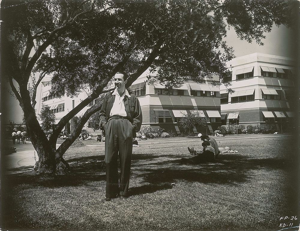Excellent original vintage glossy 9 x 7 photo of Disney on the grounds of his studio in Burbank. Reverse bears an affixed French caption. In fine condition, with some creasing to edges.