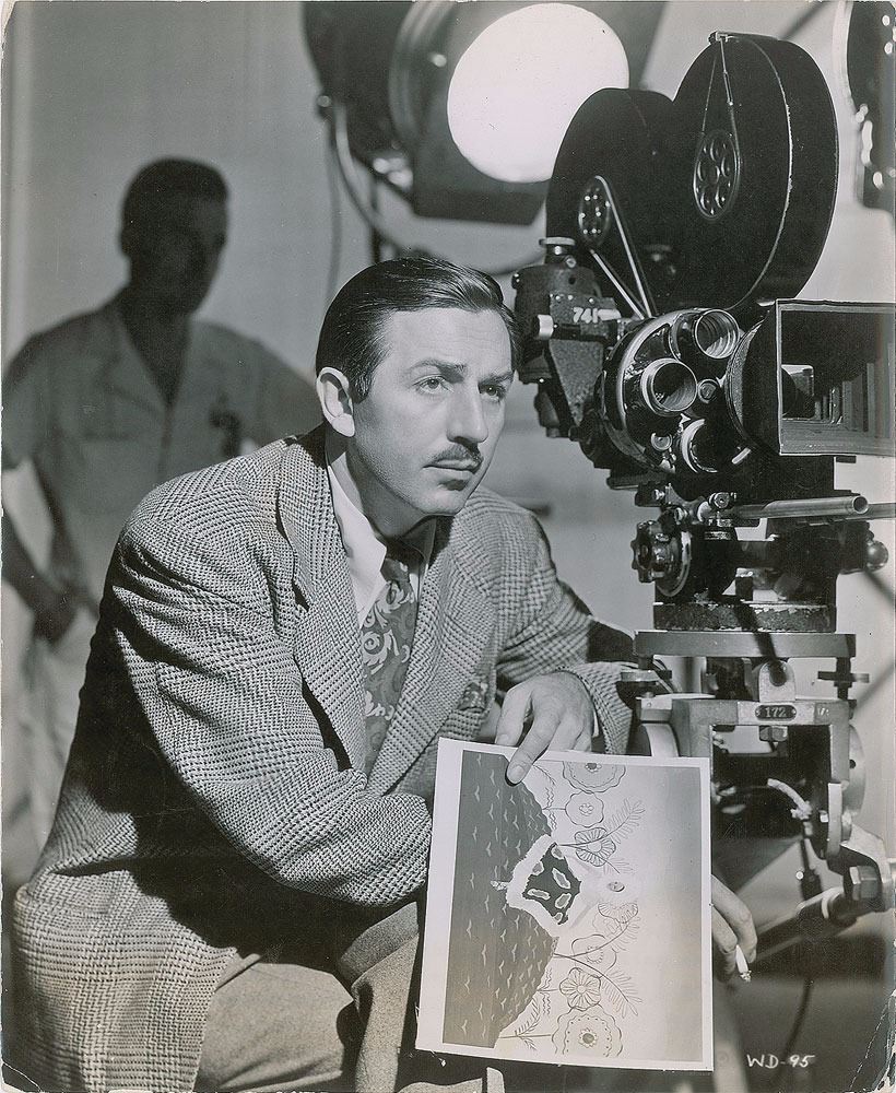 Crystal-clear original vintage circa 1944 glossy 7.25 x 8.75 photo of Disney on set for The Three Caballeros, showing him in front of a camera. Reverse bears an affixed caption and later Photofest label. In fine condition, with light edgewear.