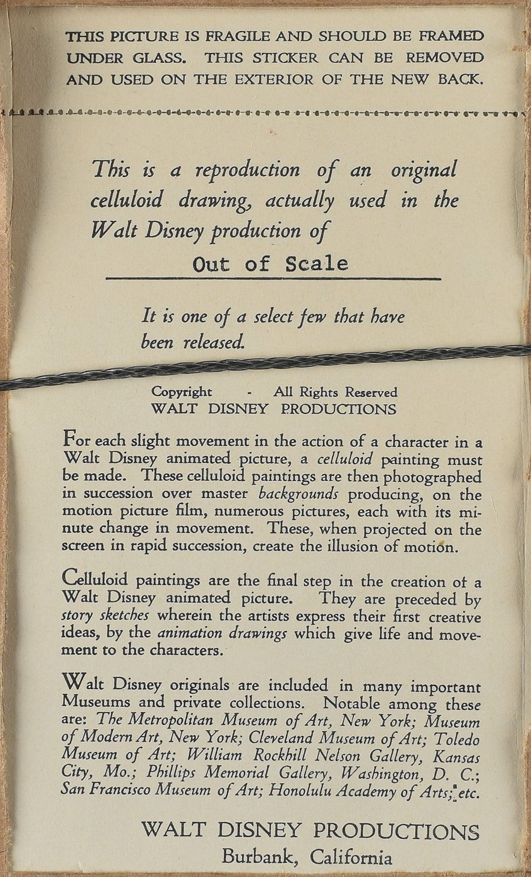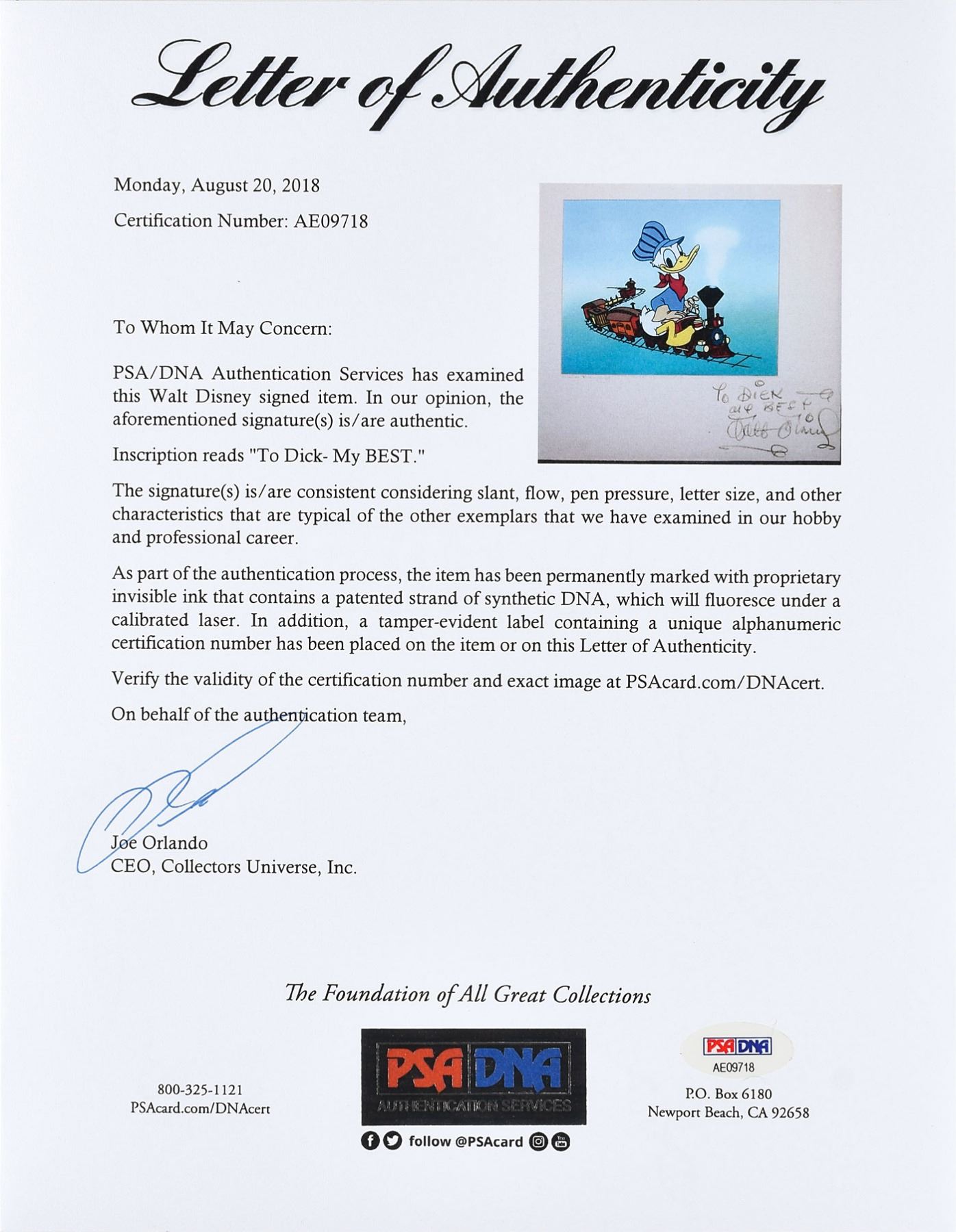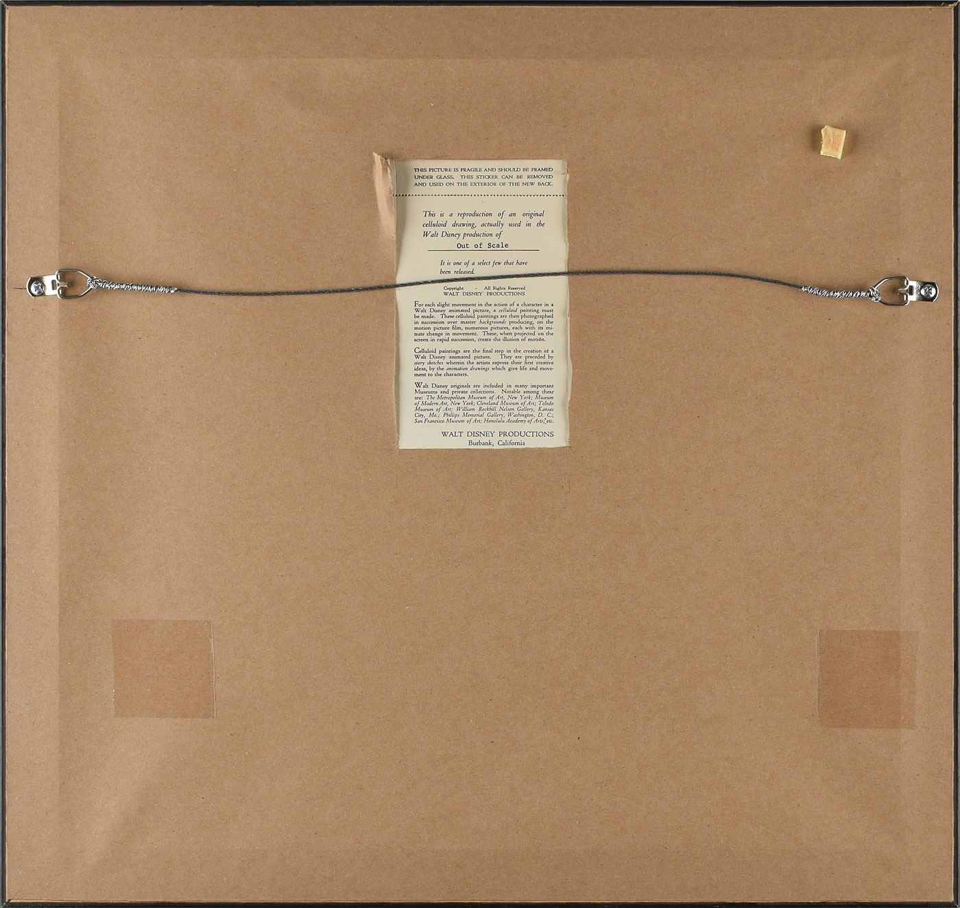Wonderful color 10 x 8 print reproducing a cel from the 1951 short 'Out of Scale,' presented in its original 15.5 x 14.5 mat, nicely signed and inscribed on the mat in brown crayon, "To Dick—My Best, Walt Disney." The image shows Donald Duck in a conductor's cap, riding a model railroad train. The reverse retains the original Walt Disney Productions label. Framed to an overall size of 18.25 x 17.25. In fine condition. Accompanied by a full letter of authenticity from PSA/DNA. Walt Disney was a famous model train enthusiast, and had his own 'Carolwood Pacific' ridable miniature railroad built in his backyard.