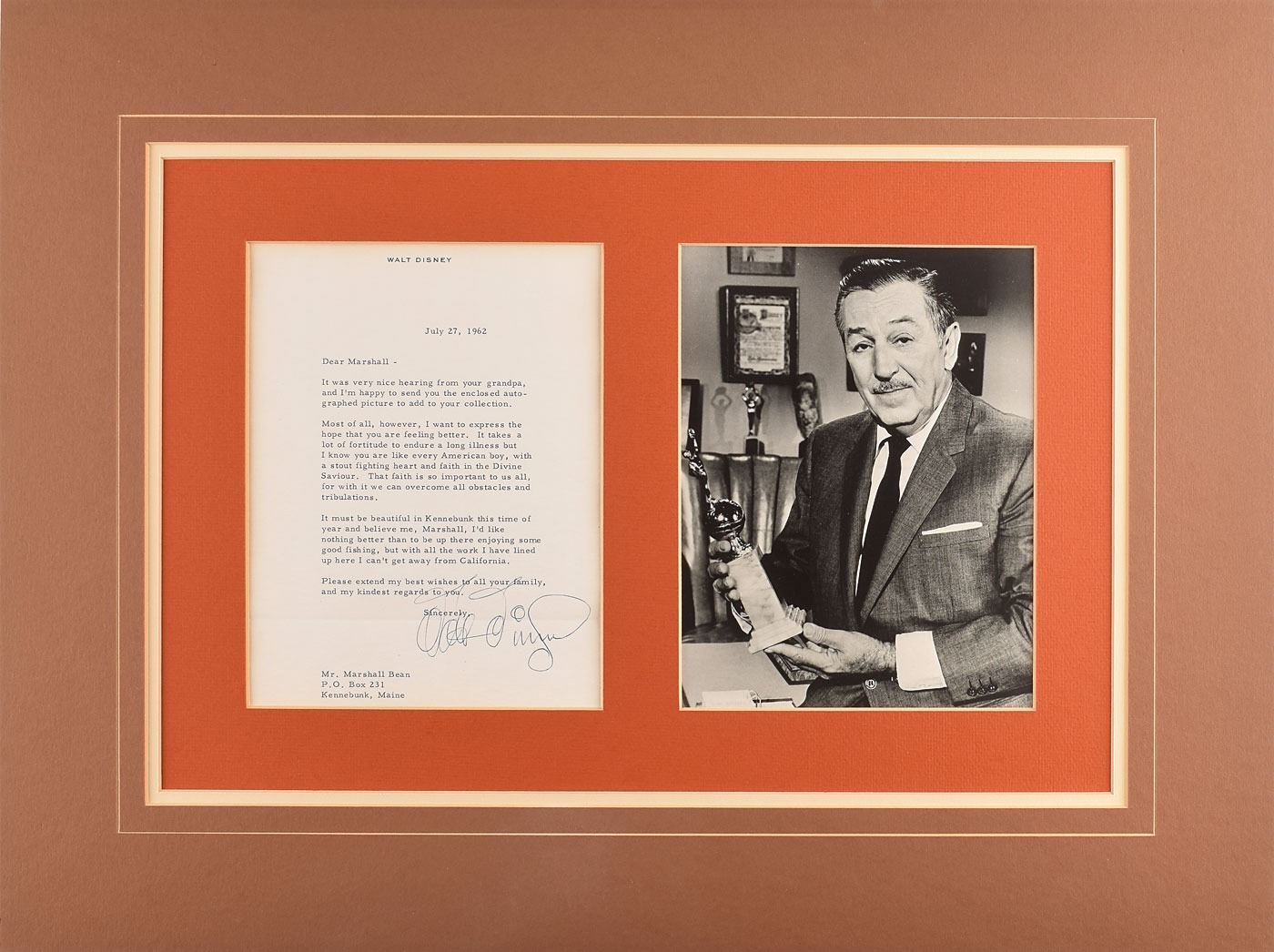 TLS, one page, 6.5 x 8.5, personal letterhead, July 27, 1962. Letter to Marshall Bean, in full: "It was very nice hearing from your grandpa, and I'm happy to send you the enclosed autographed picture to add to your collection. Most of all, however, I want to express the hope that you are feeling better. It takes a lot of fortitude to endure a long illness but I know you are like every American boy, with a stout fighting heart and faith in the Divine Saviour. That faith is so important to us all, for with it we can overcome all obstacles and tribulations. It must be beautiful in Kennebunk this time of year and believe me, Marshall, I'd like nothing better than to be up there enjoying some good fishing, but with all the work I have lined up here I can't get away from California. Please extend my best wishes to all your family, and my kindest regards to you." Triple-matted with a photo of Disney to an overall size of 23.25 x 17.25. In fine condition, with a light block of toning (which is matted out) from prior display.