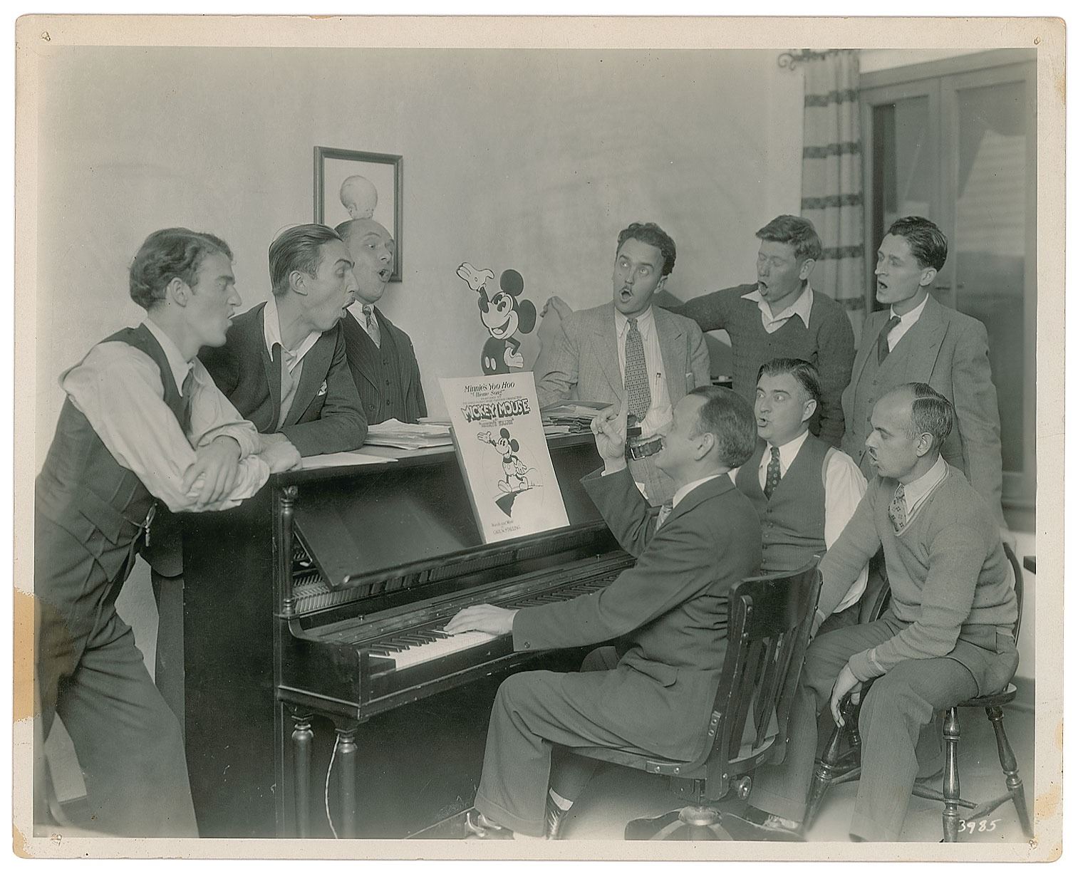 Amazing original vintage glossy 10 x 8 silver gelatin photograph of Walt Disney, John Cannon, Burt Gillett, Ub Iwerks (Disney's partner and animator of Mickey Mouse), Wilfred Jackson, Jack King, Les Clark, Ben Sharpsteen, gathered around composer Carl Stalling at a piano and singing 'Minnie's Yoo Hoo.' Those pictured are identified on the reverse in pencil. In very good to fine condition, with two subtle diagonal creases, tack holes to corners, and staining confined to the left edge.