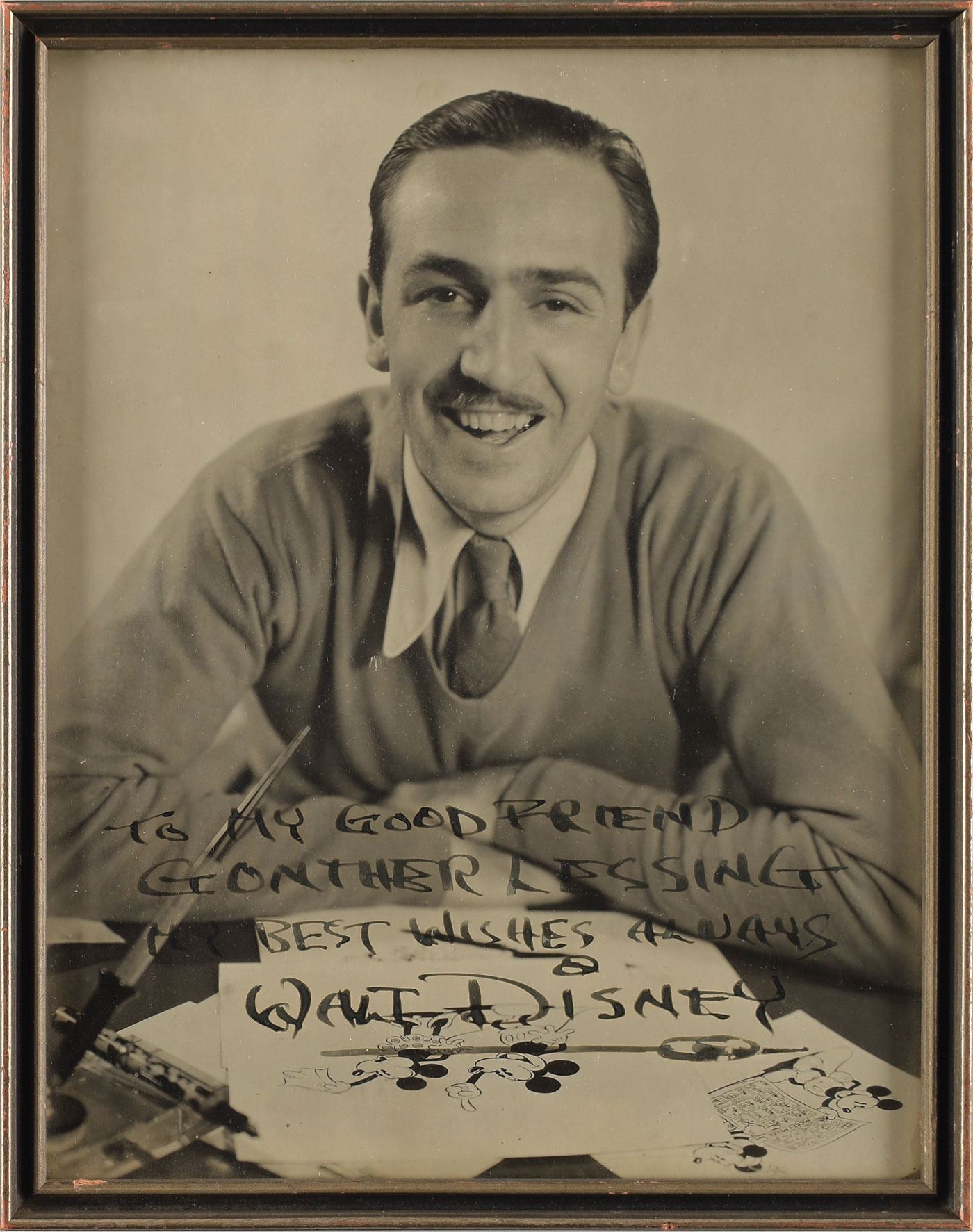 Both originate from the estate of Gunther R. Lessing, Disney's early and most important legal advisor. After being hired to represent Walt and Roy Disney in a 1929 case against predatory distributor Pat Powers, Lessing would remain an integral part of the studio's legal department for 35 years, rising to vice president and general counsel of Walt Disney Productions. One of his lasting early legal achievements was turning the 'Walt Disney' name into a trademark upon which the now-famous brand could be built. Between the simply marvelous early image and its significant association to a loyal member of his executive team, this may be the best signed Walt Disney portrait we've ever offered.