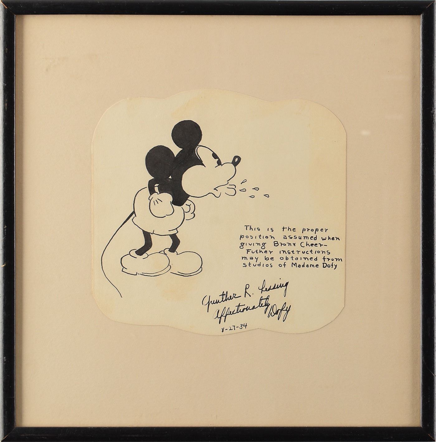 Accompanied by a neat sketch of Mickey Mouse spitting, accomplished in ink on an off-white 6.25 x 6.25 sheet by an unknown artist, captioned, "This is the proper position assumed when giving Bronx Cheer—further instructions may be obtained from the studios of Madame Dofy," and signed and inscribed below, "Gunther R. Lessing, Affectionately, Dofy, 8-27-34." Mounted and framed to an overall size of 10.75 x 11.
