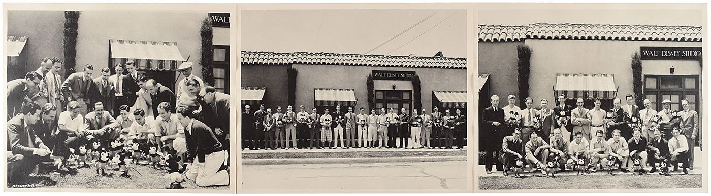 Three second-generation matte-finish 10 x 8 silver gelatin prints of early images showing Walt Disney with his staff outside their Hyperion Studio, celebrating the success of the first stuffed Mickey Mouse doll created by Carolyn Clark. In overall fine condition, with some waviness to edges.