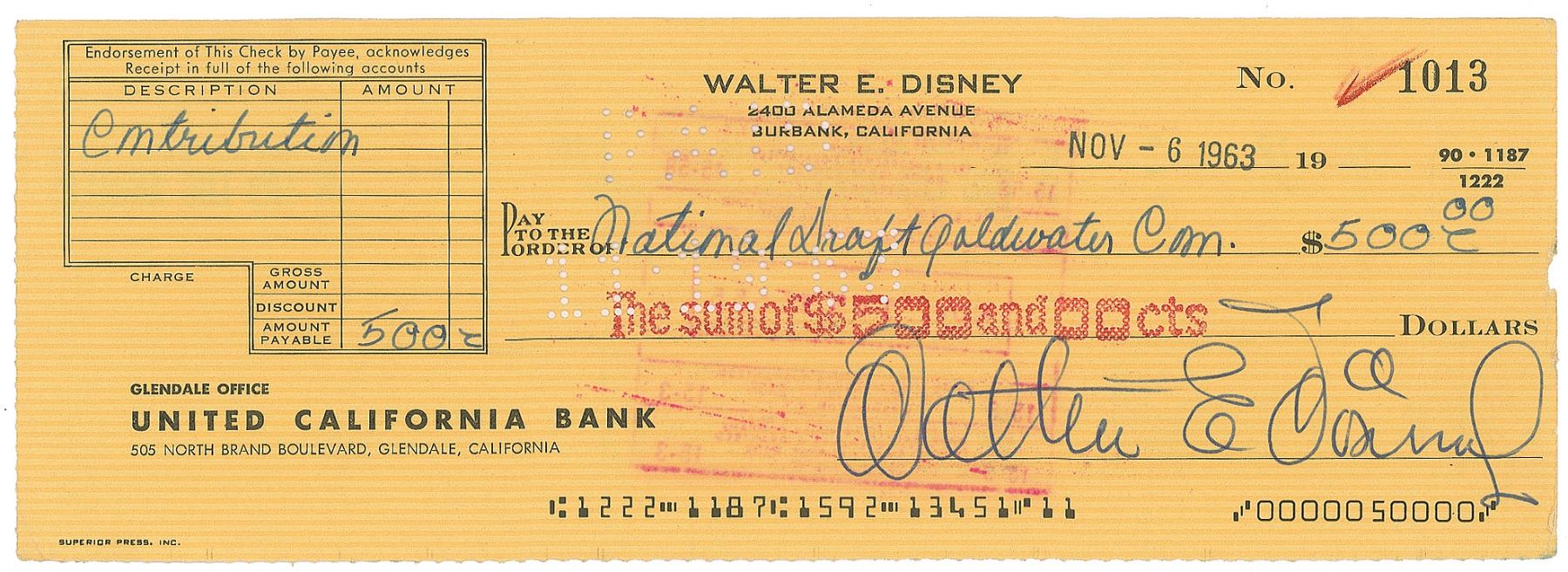 Desirable personal check, 8.5 x 3, filled out in another hand and signed by Disney, "Walter E. Disney," payable to the National Draft Goldwater Committee for $500, November 6, 1963. In fine condition. The Draft Goldwater Committee was the organization primarily responsible for engineering the nomination of Arizona Senator Barry Goldwater for president of the United States on the 1964 Republican Party ticket.
