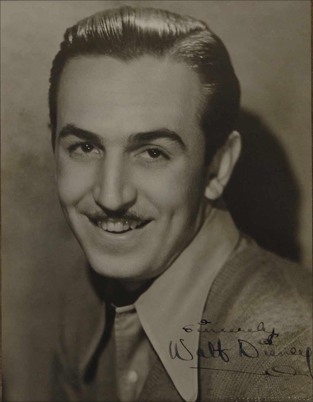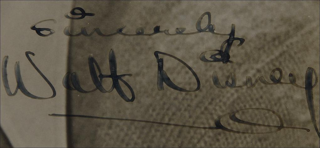 Fabulous early vintage matte-finish 8 x 10 Clarence Sinclair Bull portrait of Disney smiling genuinely for the camera, beautifully signed in fountain pen, “Sincerely, Walt Disney.” Double matted and framed to an overall size of 13 x 15. In fine condition, with a couple minor scattered light surface marks and creases.