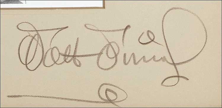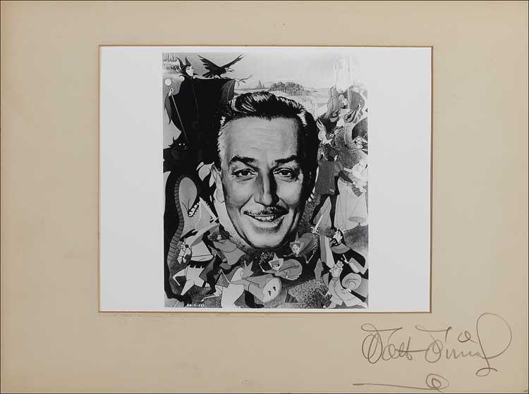 Vintage off-white mat, 16 x 12, which originally held a cel or image from the cartoon entitled “Donald’s Dilemma,” and lightly labeled as such in pencil, signed in black artist’s pencil by Disney. Cel has been replaced with a satin-finish 14 x 11 composite photo. Trimmed horizontal edges, and some scattered light soiling and scuffing, otherwise fine condition. Pre-certified PSA/DNA and RRAuction COA.