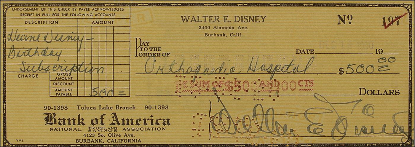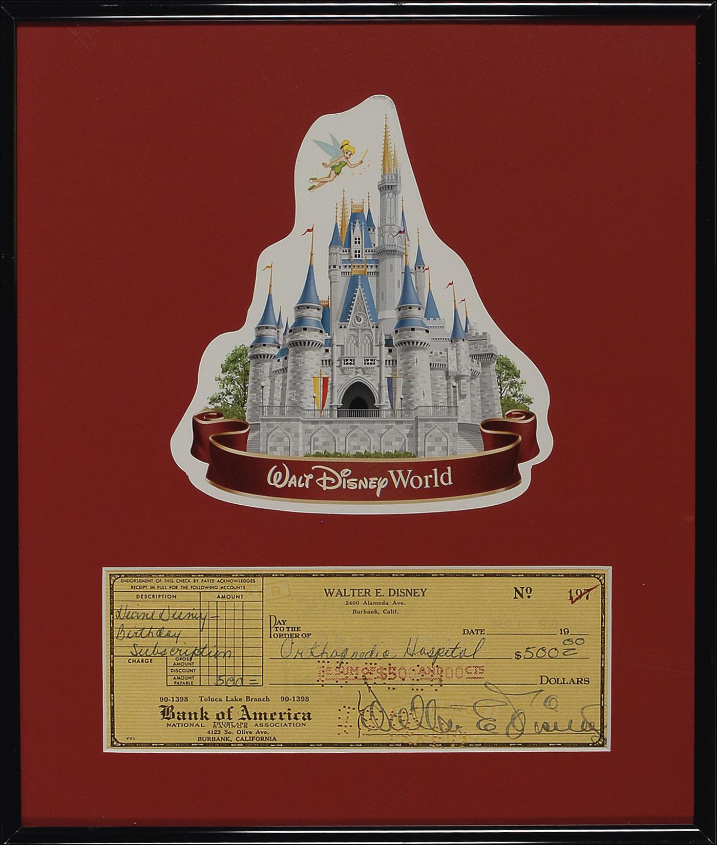 Personal check, 8.5 x 3.25, filled out in another hand and signed by Disney, “Walter E. Disney,” payable to Orthopedic Hospital for $500.00, stamp dated December 18, 1950. Matted and framed with a colorful Disney World logo, to an overall size of 11.5 x 13.5. In very good condition, with cancellation holes over first name of signature, a red notation to top right, two vertical folds, and light show-through from stamps on reverse. Pre-certified PSA/DNA and RRAuction COA.