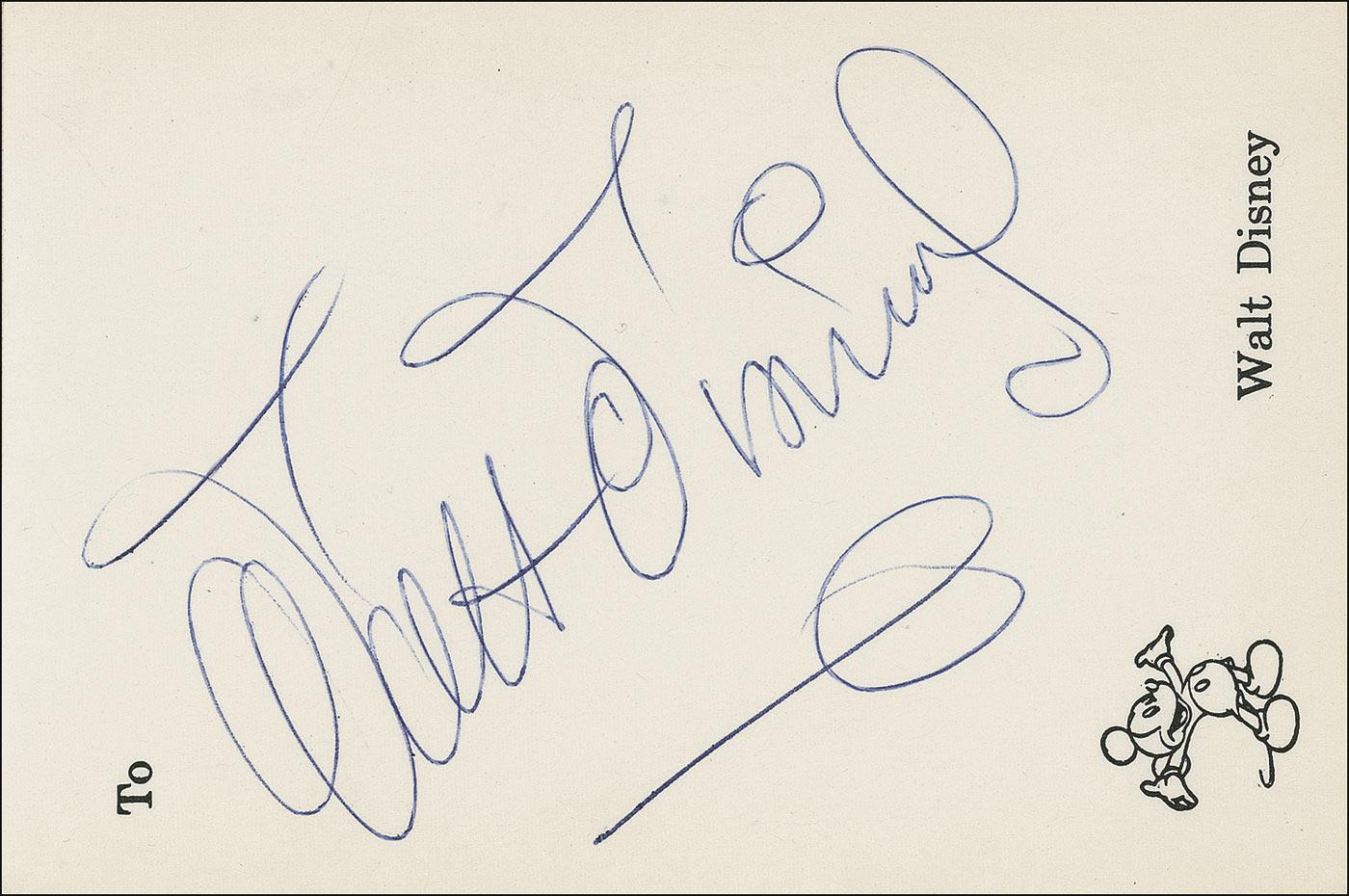 Large vintage ballpoint signature, “Walt Disney,” on an off-white 4 x 6 sheet of Disney’s personal note paper. Accompanied by a certificate of authenticity from Phil Sears. In very fine condition. Pre-certified PSA/DNA and RRAuction COA.