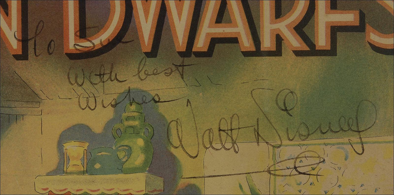 Vintage color book cover, most likely from Walt Disney’s Famous Seven Dwarfs, 12 x 12, featuring all the dwarfs but Dopey sitting around the dinner table, signed and inscribed in fountain pen, “To Sue, With best wishes, Walt Disney.” Double matted and framed to an overall size of 20 x 19.5. Walt Disney’s Famous Seven Dwarfs, published in 1938, was one of many oversized Disney children’s books issued by Whitman Publishing between the years of 1935-42. In very good to fine condition, with a couple small areas of paper loss along edges, creasing along bottom edge, light contrast to name in inscription, and a bit of trivial spotting. Pre-certified PSA/DNA and RRAuction COA.