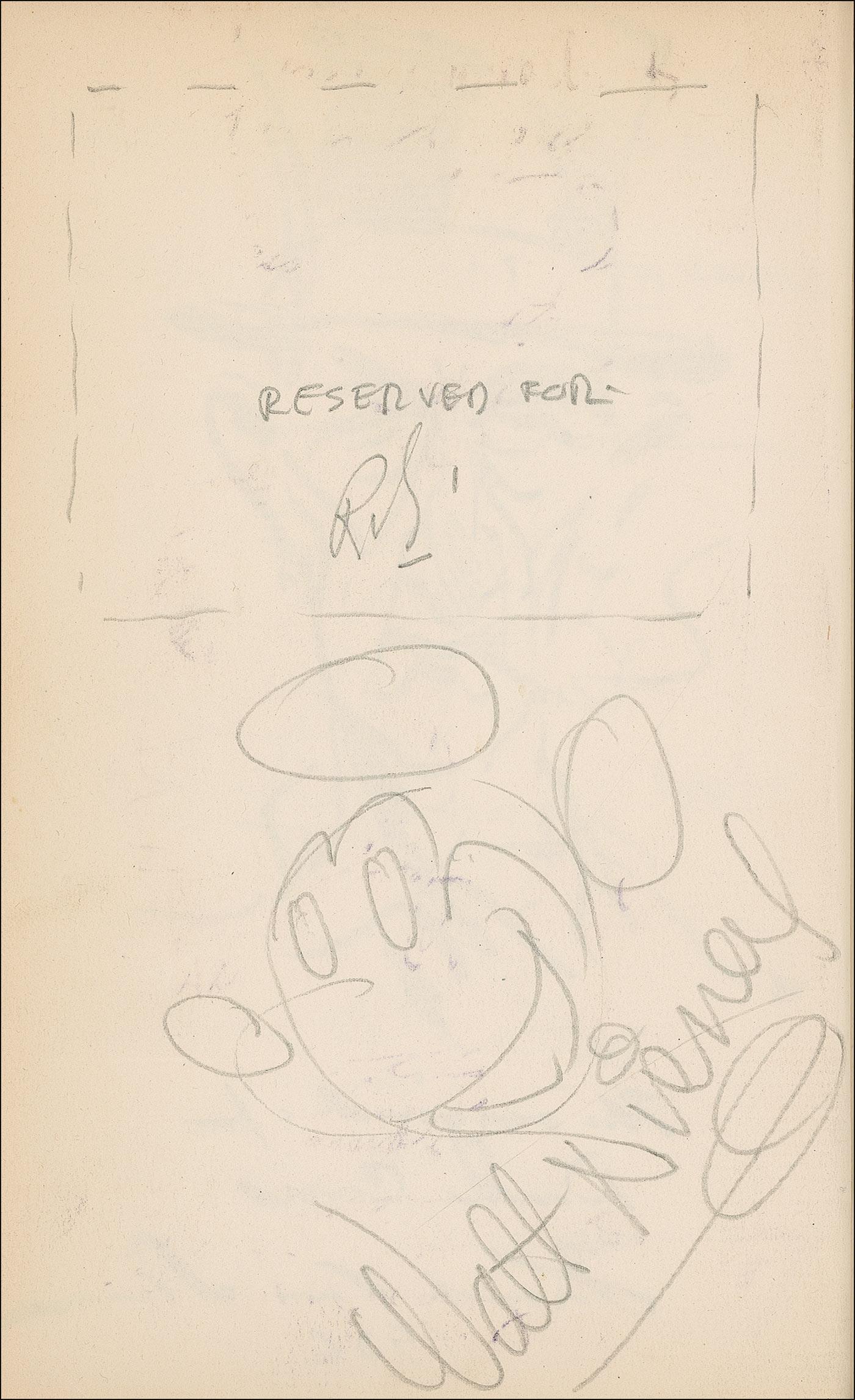 Contrary to popular perception, Disney never completely animated a single Mickey Mouse cartoon or drew a single Mickey comic. He would, on those rare occasions, offer a quickly constructed version of his iconic figure. To that end, a drawing of Mickey in Disney’s hand is a very rare item, indeed, often with years passing between quality offerings appearing for sale. Such an elusive “on the spot” drawing is provided here, as Disney acknowledged—perhaps after a bit of wining and dining—a special request from a member of the Bohemian Club. Perhaps it was during this very encounter that Disney was “inspired” by his elite—and mundane—surroundings to develop the snoring scene in the dwarfs’ cottage in Snow White and the Seven Dwarfs. This example is truly among the rarest of the rare. Pre-certified PSA/DNA and RRAuction COA.